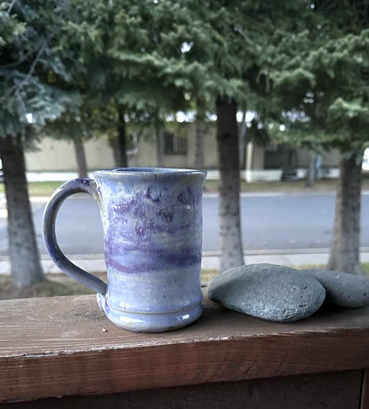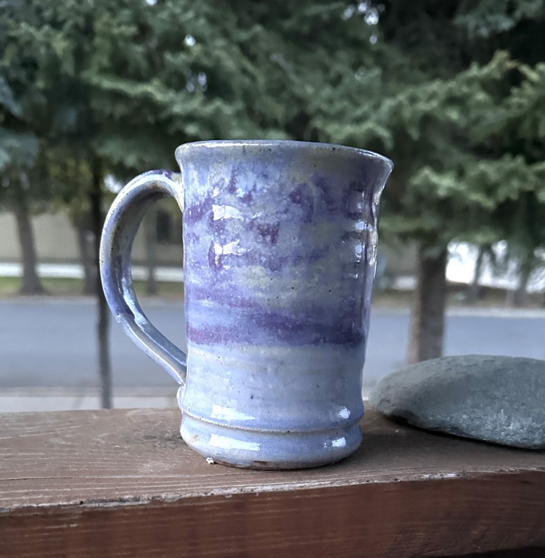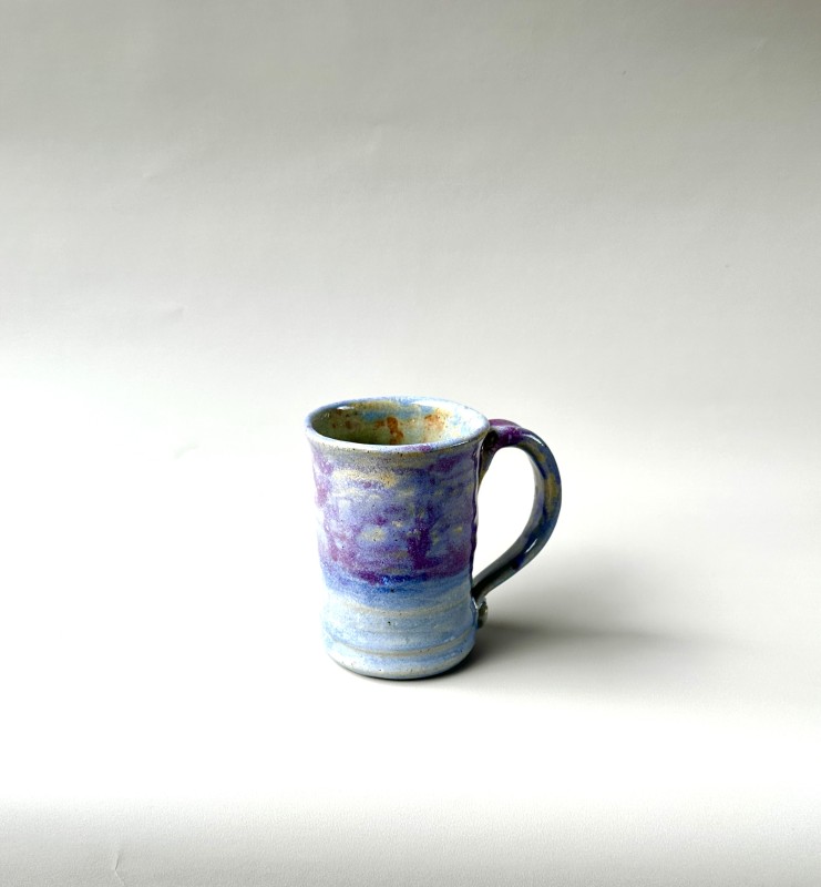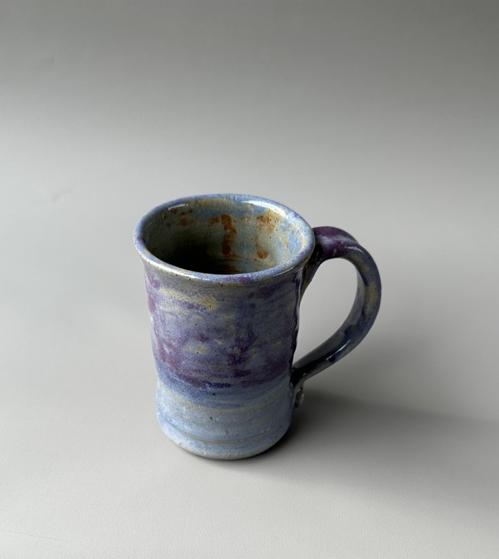 Beautiful and sturdy wheel thrown mug. With a large well-balanced handle. The interior of the mug is a smooth glaze, easy for clean up and drizzled interior color to add interest. The pulled handle is also smooth for gripping making it a balanced, functional, fun to look at and use mug.