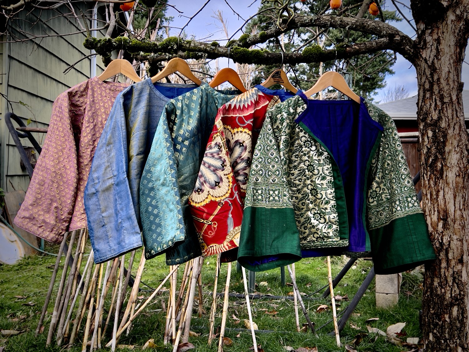 This Little Silk Jacket is an outer shell of a blue shot with gold silk. The lining is bright blue silk. The inner-lining is 100% cotton.