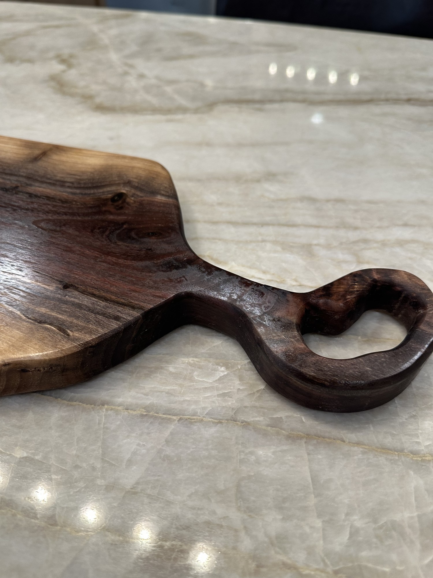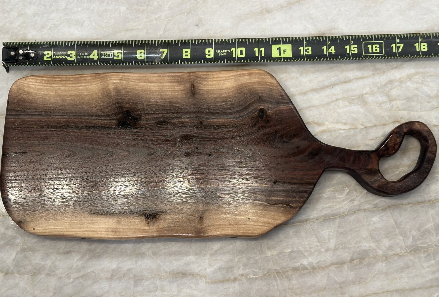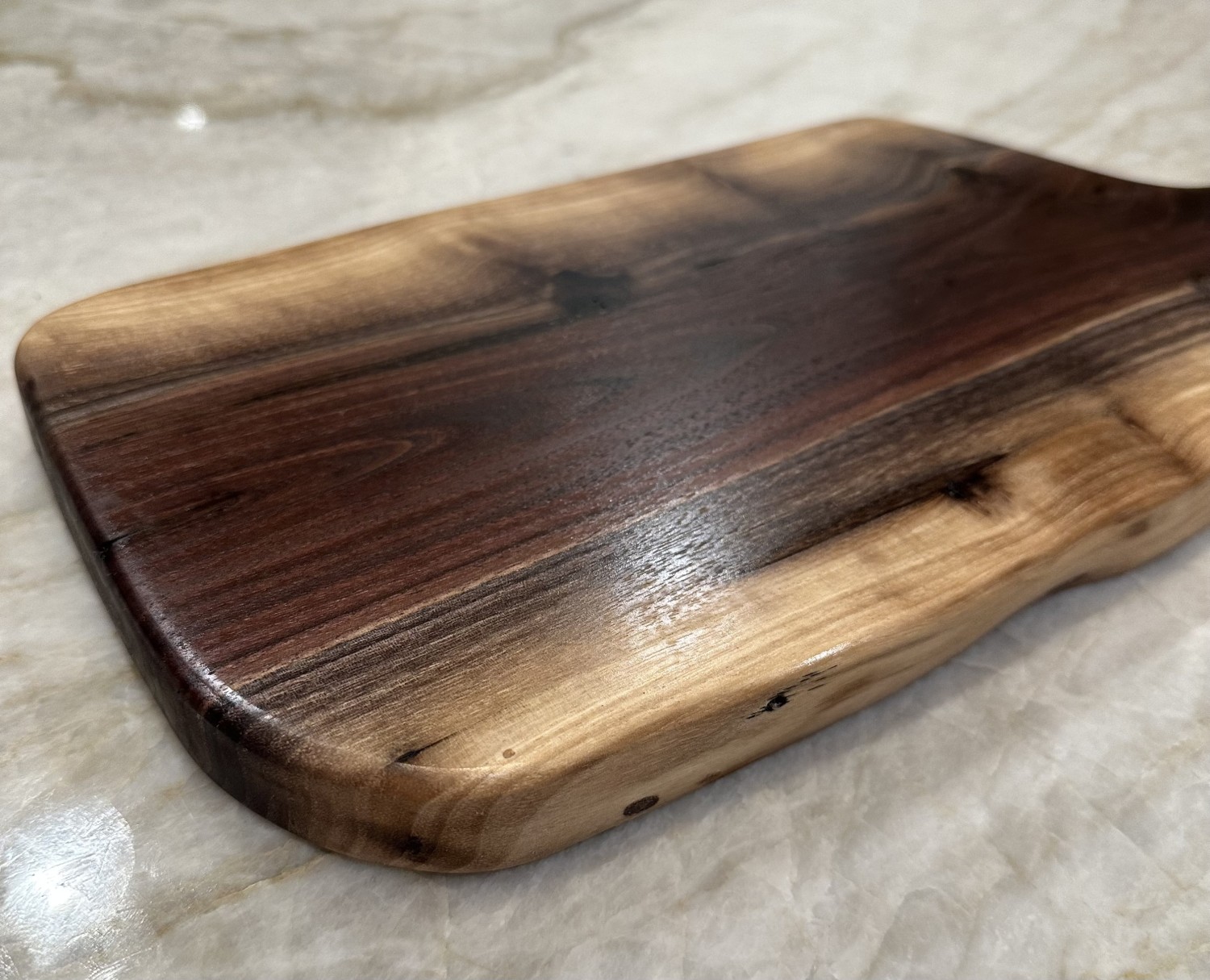 This is a one piece live edge charcuterie/ cutting board made from locally milled black walnut. It is a one of a kind piece that is sure to add character to your kitchen. It measures 18” x 7” x 1”