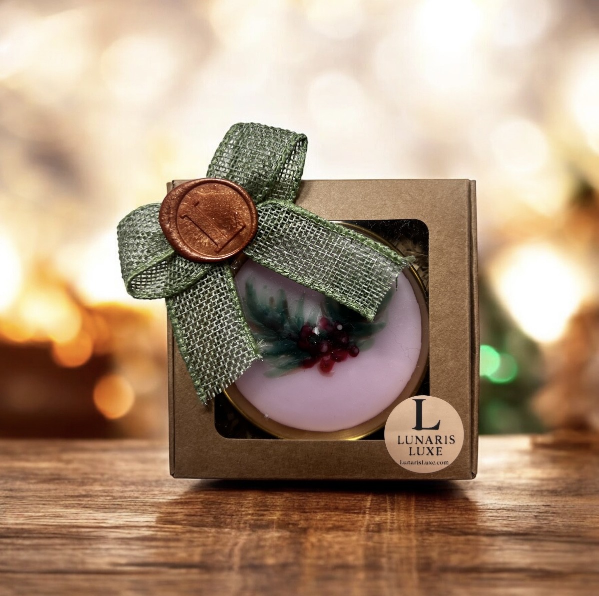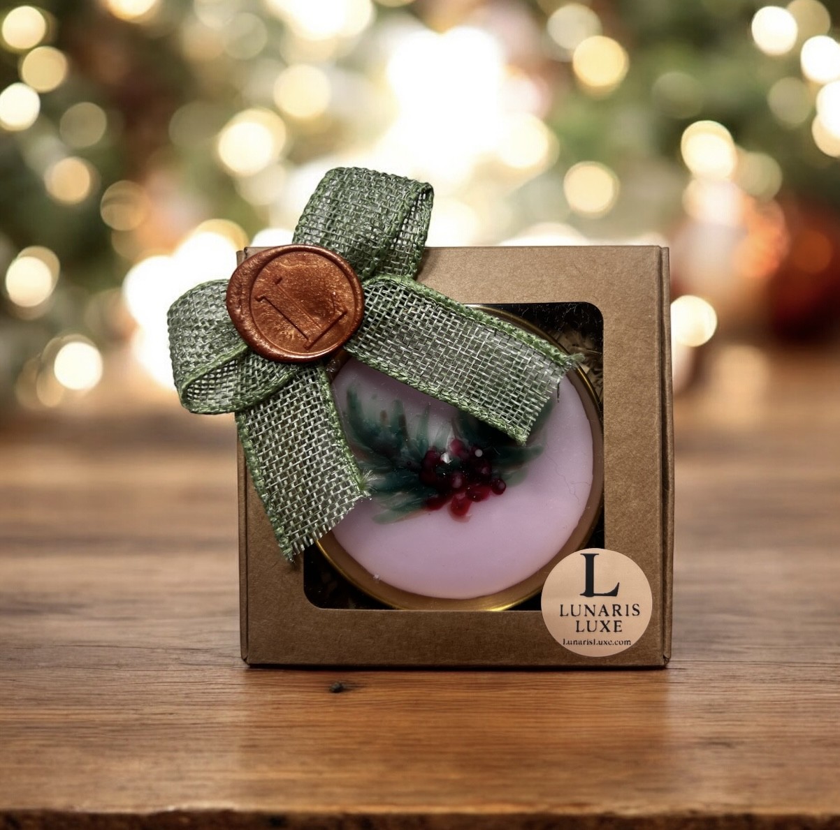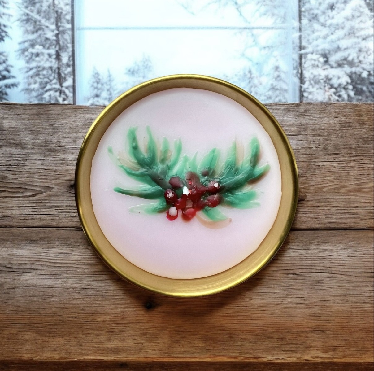 Hand-poured, art-inspired Christmas candles. each with 1 medium candle per box, 3.15 inch brass bowl, Burn time: 9+ hours