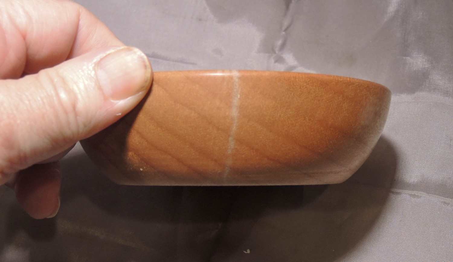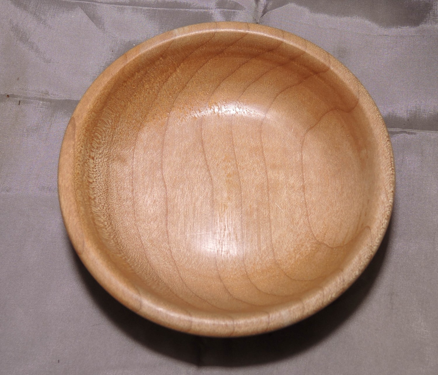 This maple bowl is 4-3/4" diameter at the top and just under 1-1/2" tall. It has a natural oil/wax finish.