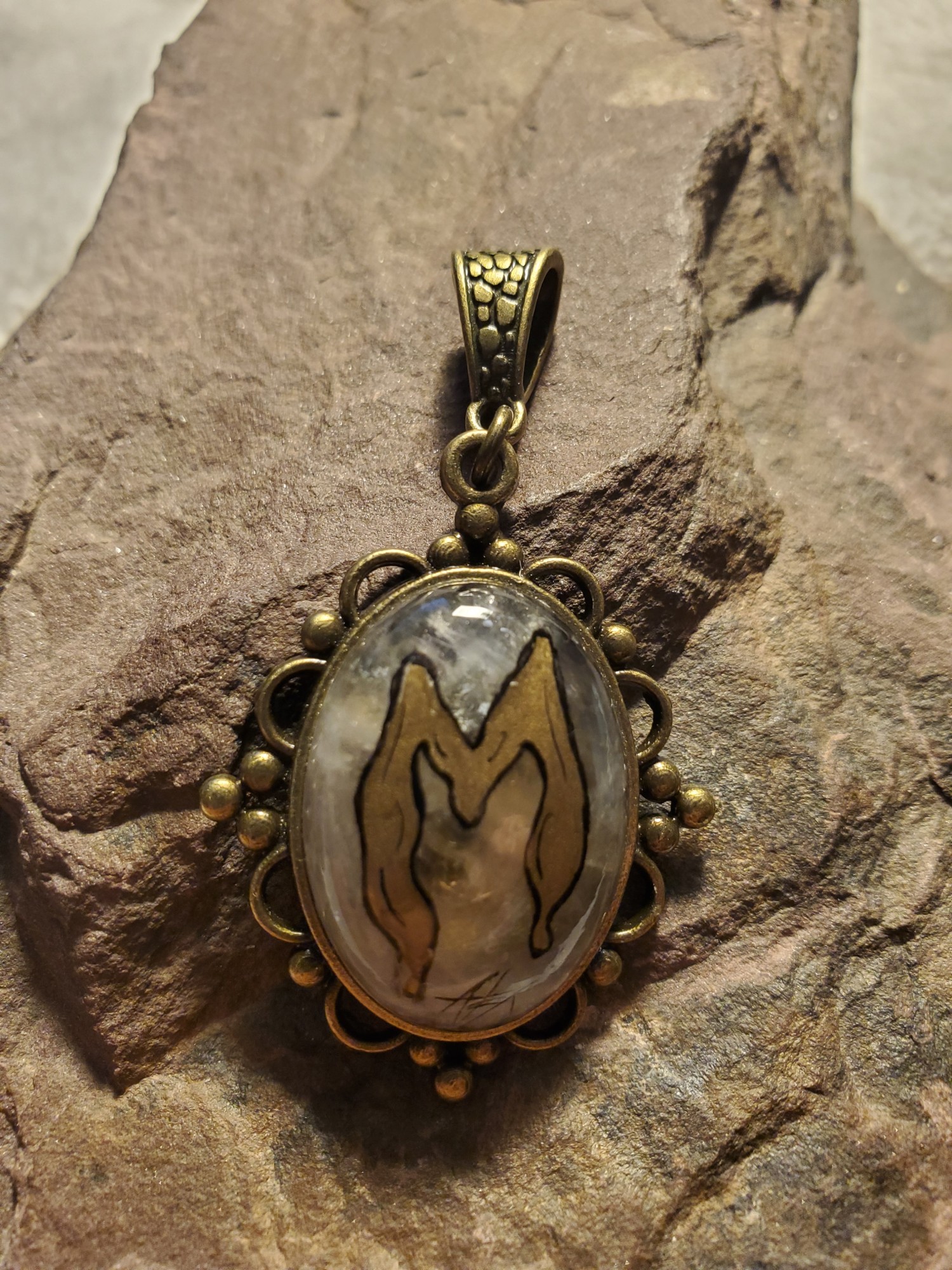 Maunche , East Kingdom Award, Rock Crystal in Bronze, Crushed Gold Leaf Enamel and outlines painted with a cat whisker