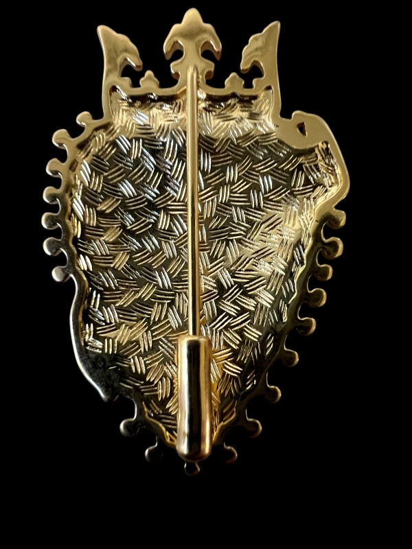 Made from high-detail bearing jewelers' brass, featuring a solid pin on the back side.