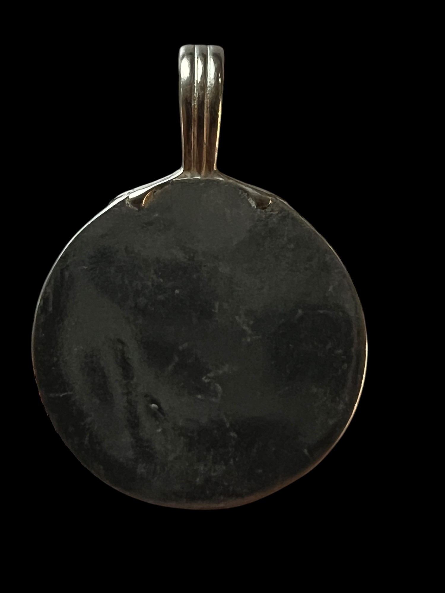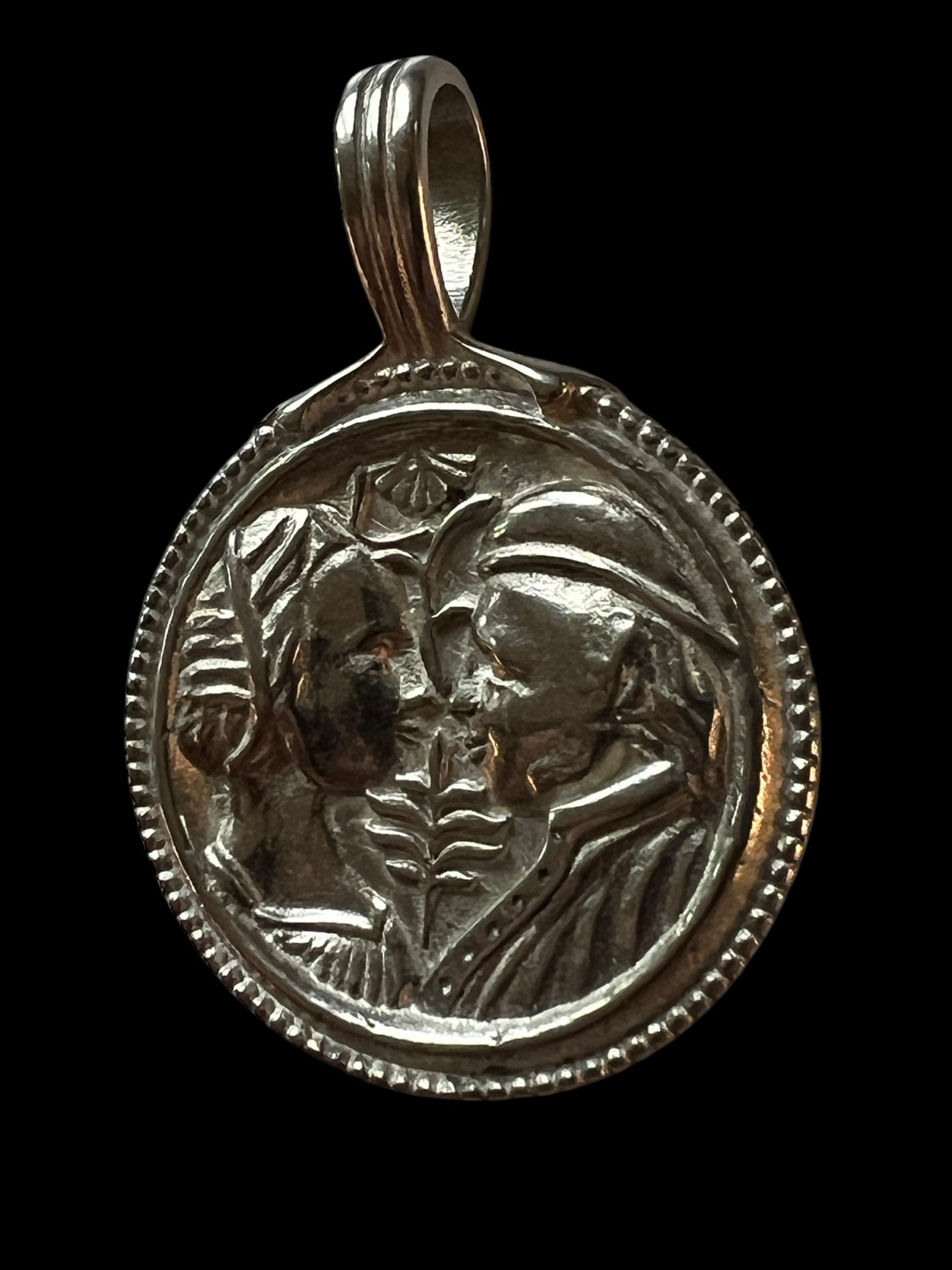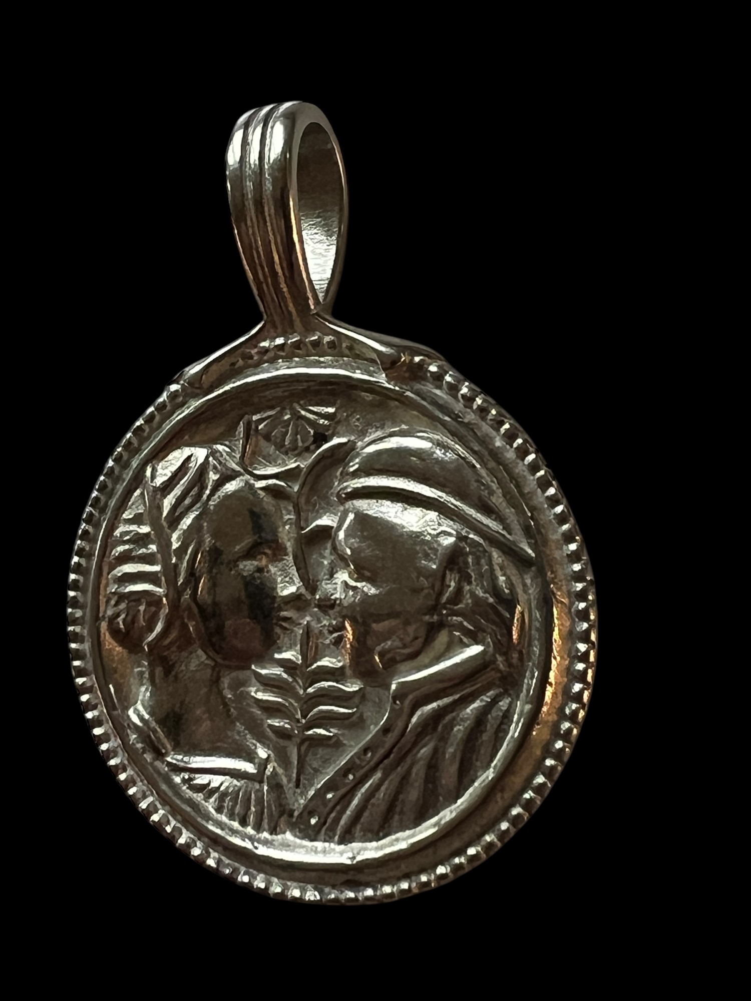 We have done this one out of nickel. It features a man and a woman gazing at one another, a clear pair. We've left the back plain, so we can, for a small extra fee, custom engrave words of your choice on the back.