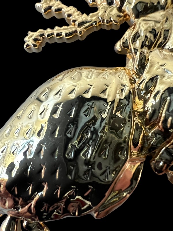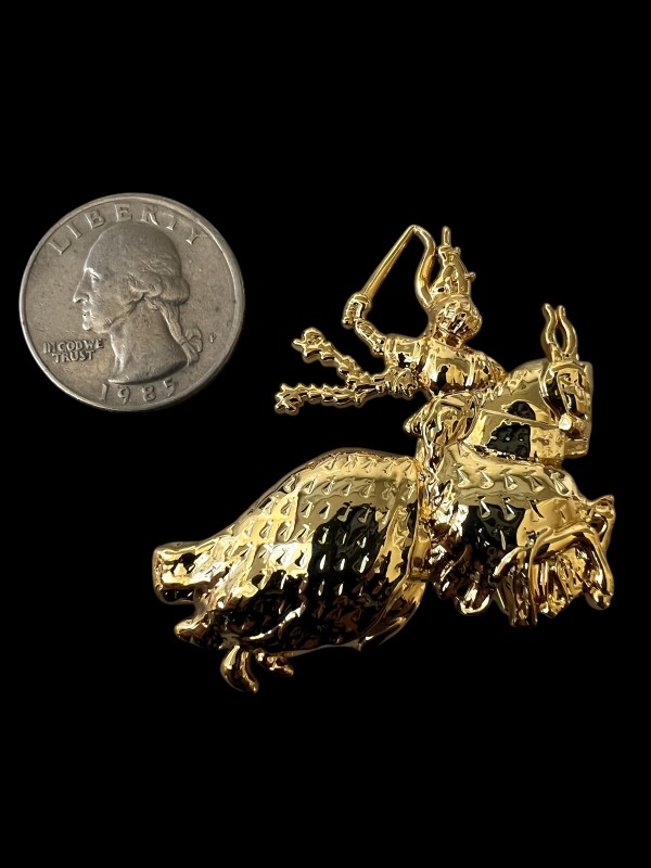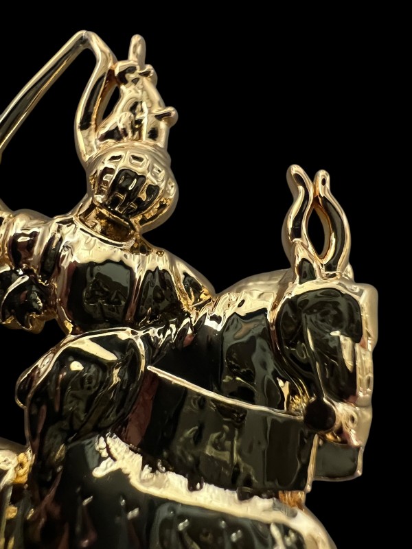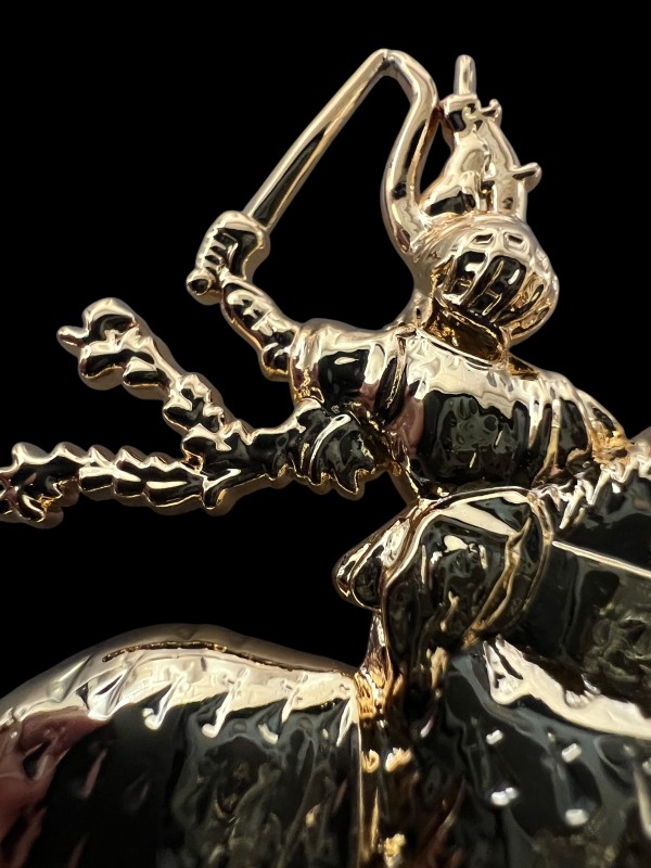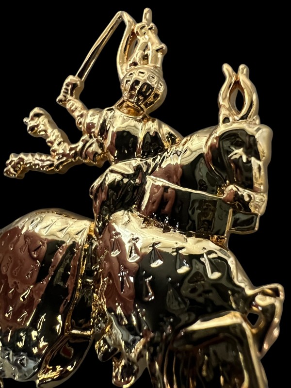 Big bold figure from King Rene's Livre de Tournois, featuring a rebated tourney sword, grille and elegant horse trappings, plated in 18k gold, such that "chivalry should not tarnish."