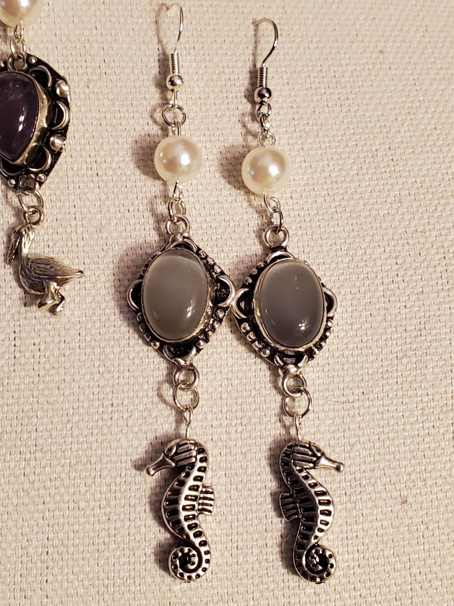 Moonstone Seahorse Ear Rings - Silver Gray Moonstone , Pearls in Sterling Silver