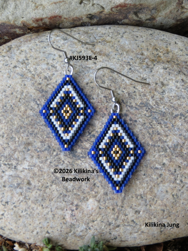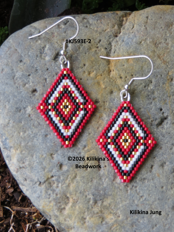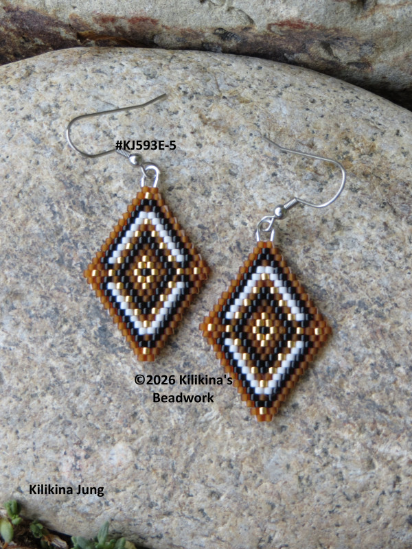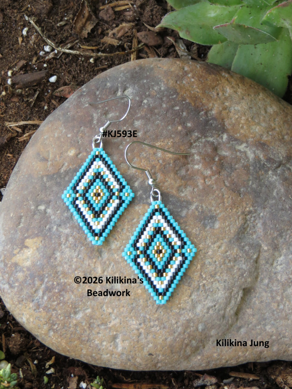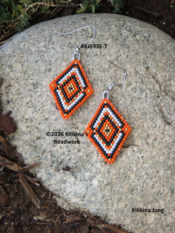These cute handmade Navajo Rug earrings are very light weight, made of Delica seed beads - they measure about 1" wide and about 1 1/2" long (not including the hooks). These measurements are estimated. The beadwork is hand sewn. These earrings are currently on stainless steel fishhooks. The fishhooks can be changed to posts or clips if requested. Buyer must request the change by message, before or when the item is purchased, as for I need to make any changes before packing and/or shipment. Purchased pattern credit: GaligePatterns, changed and beaded by Kilikina.