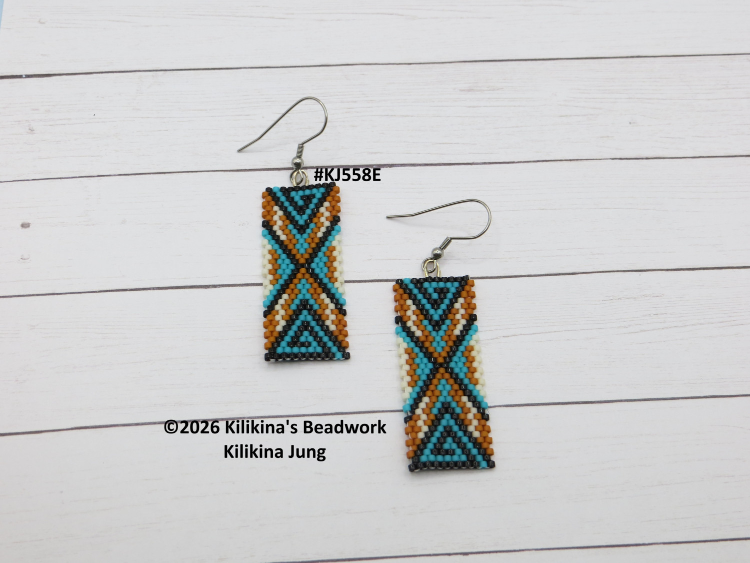 These earrings are made of Delica seed beads. They measure about 3/4" wide and about 2" long (not including the hooks). All measurements are approximate due to bead size variation. The beadwork is hand sewn. These earrings are currently on surgical steel fishhooks. The fishhooks can be changed to posts or clips if requested. Buyer must request the change by message, before or when the item is purchased, as for I need to make any changes before packing and/or shipment. Pattern Credit LutitaPatterns, made and beaded by Kilikina.