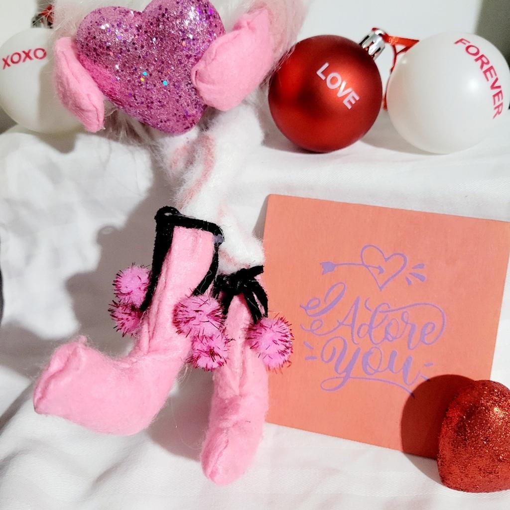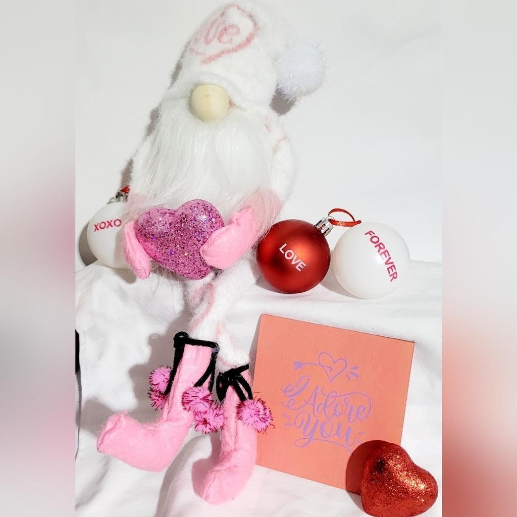 Hand crafted super soft and fluffy white, with pink hearts, gnome, holding a pink glitter heart, wearing hot pink mittens and hot pink, black laced, sparkly pom pom boots, with LOVE scrawled across his hat and back. He's adorned with a wooden nose, white beard, positionable limbs, a white sparkly pom pom on his hat, and he stands approximately 12" tall.