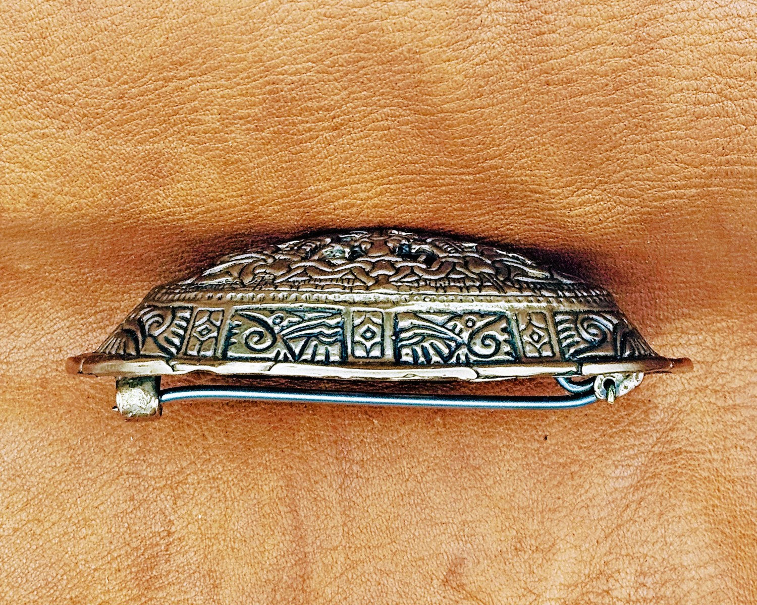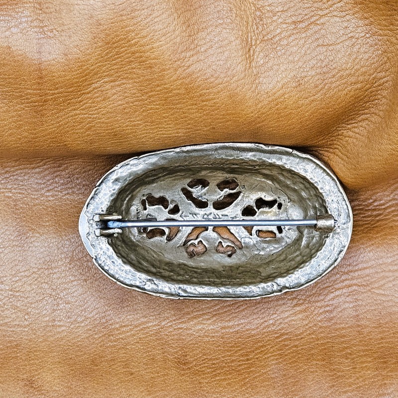 Description: Based off original women's oval or tortoise brooches, dated to 10th c. Norway. Various designs were known throughout Scandinavian countries during the Viking Era.