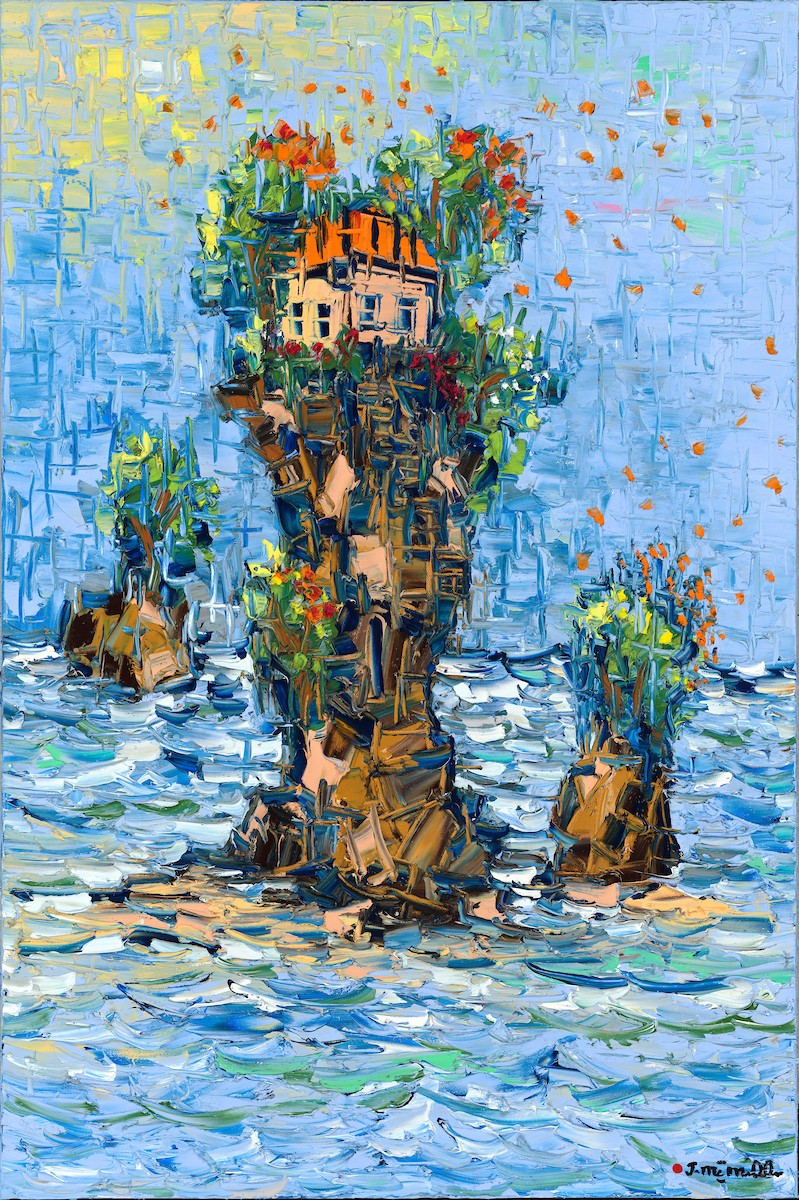 •The focal point of the painting is usually a small island, nestled in the embrace of the boundless ocean. The island may be adorned with white sandy beaches, their grains glistening under the radiant sun.