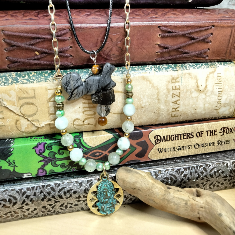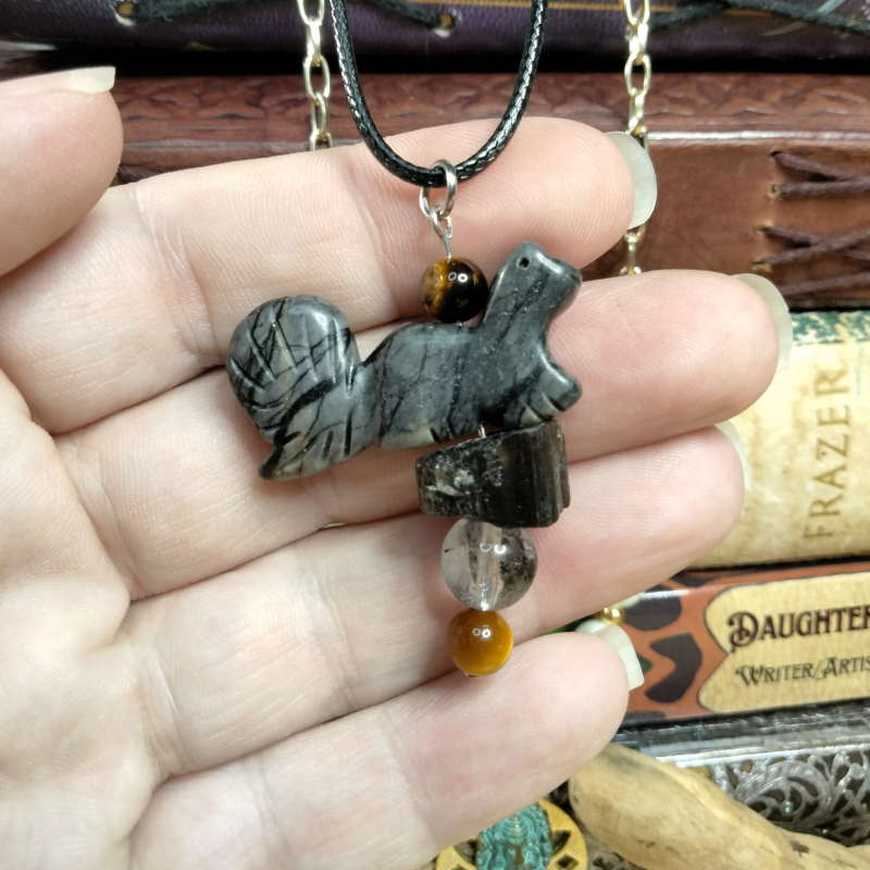 tourmaline quartz and Picasso jasper squirrel with details viewable on both