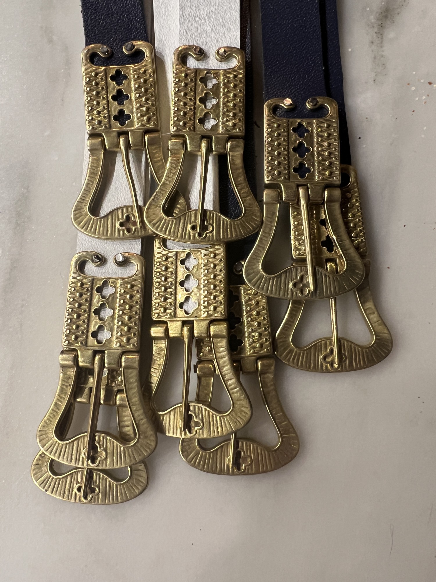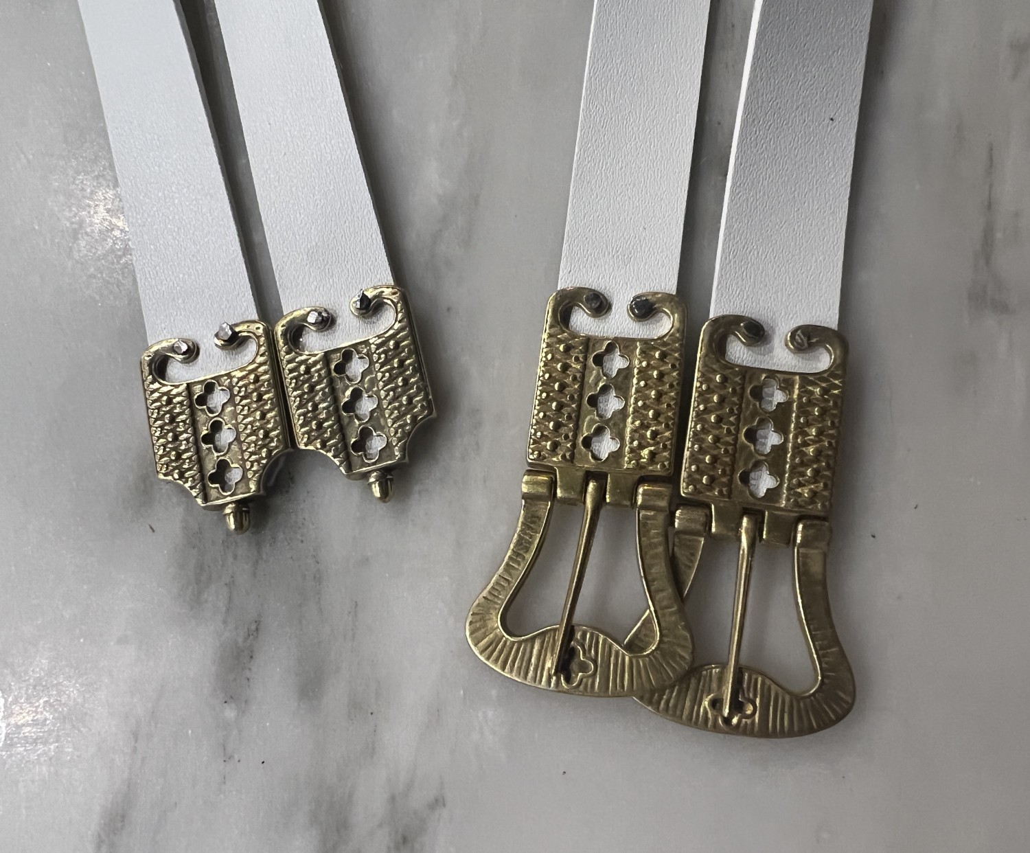 24" long high-quality Spanish leather garters suitable for 13th and 14th century chausses! Available in-stock in the colors noted below, or custom colors available. Uses our very fine Thames River find buckle and tip, letting the color of the leather show through. Sold in pairs. Other colors available as custom (2-3 weeks for delivery); dark green, "tres riche" blue, black, brown, burgundy ("dark red"), red, yellow, green.