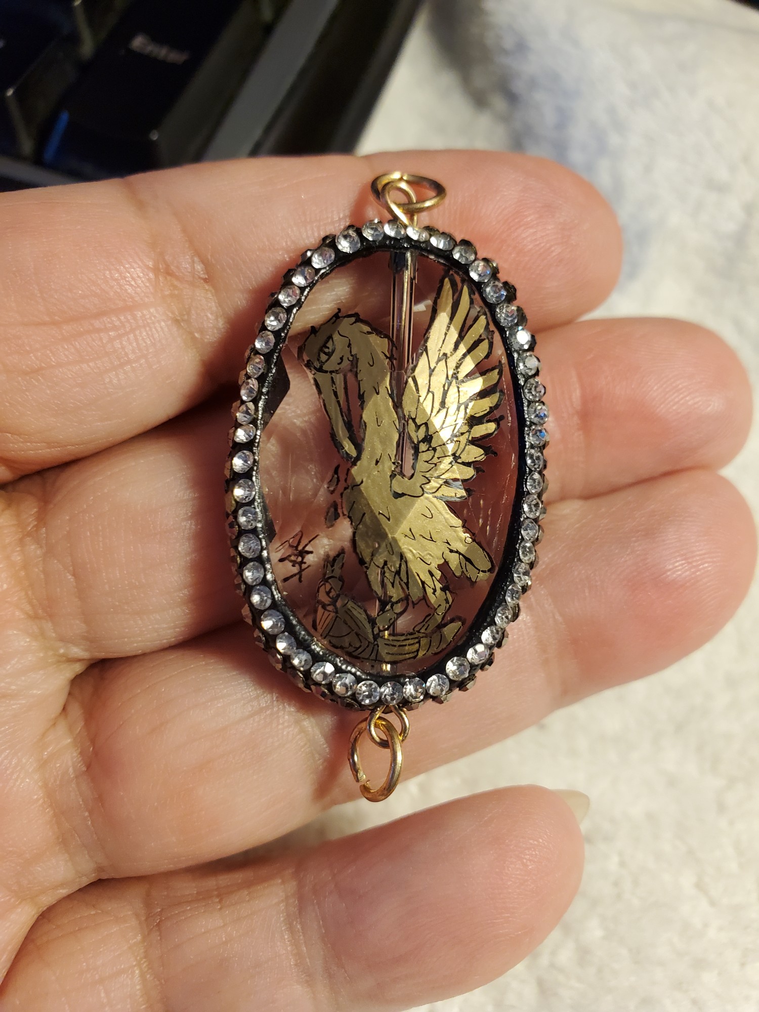 Pelican , Crushed Gold Leaf Enamel and outlined with a cat's whisker, Faceted Glass, Rhinestones