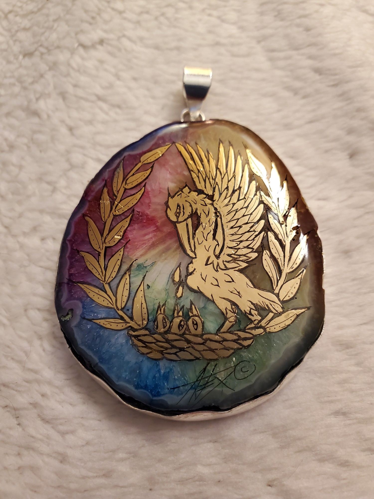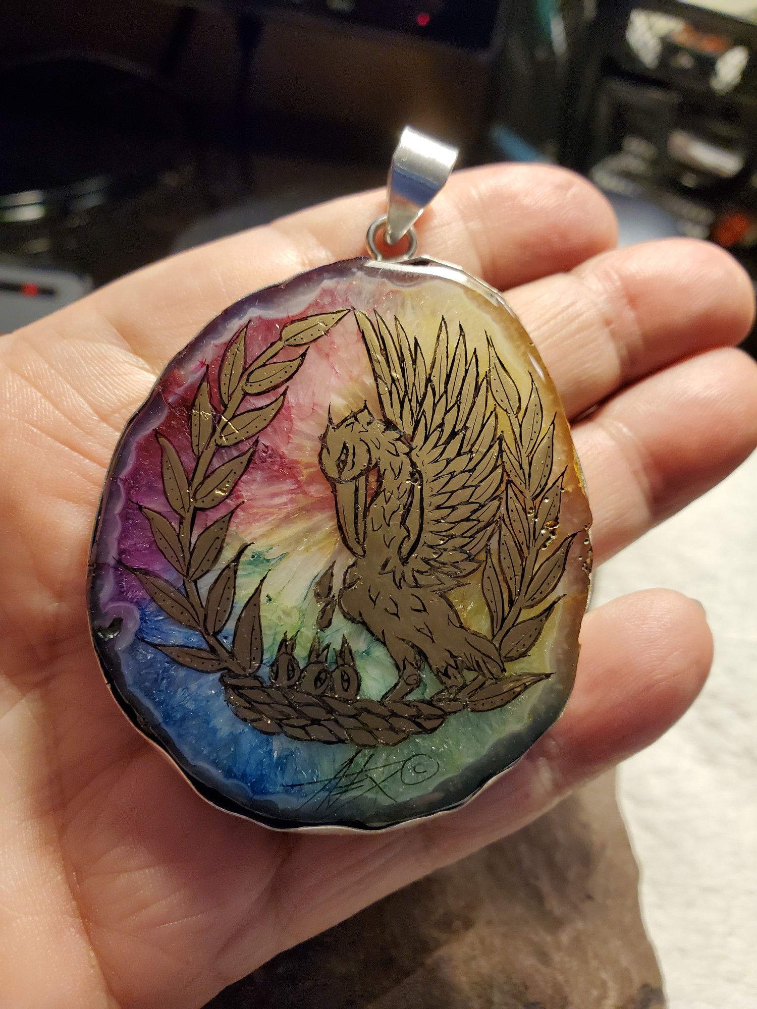 - Solar Quartz in Sterling Silver, Crushed Gold Leaf Enamel and outlines done with a literal Cat's Whisker