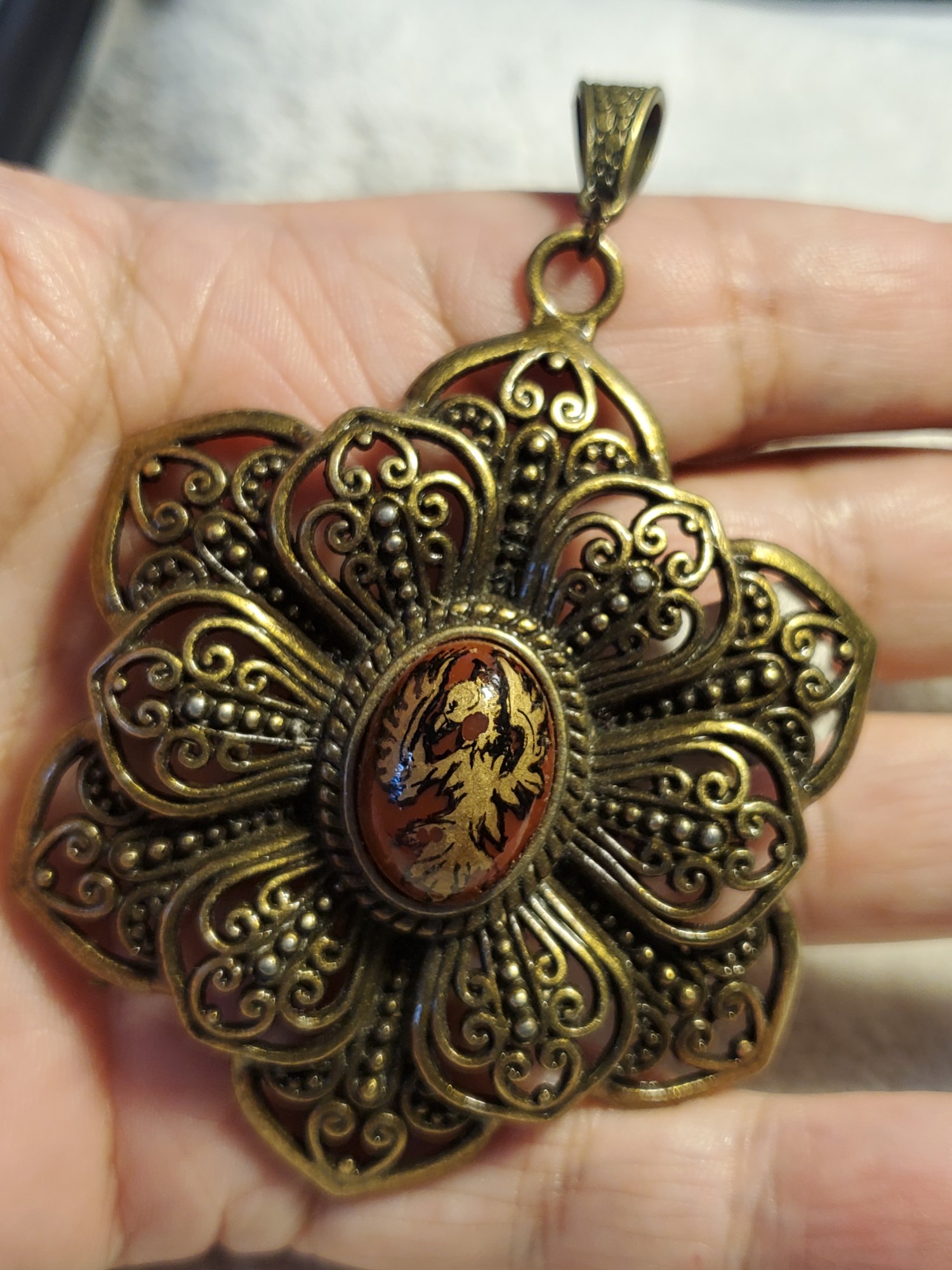 Phoenix Pendant, One of a Kind, Crushed Gold Leaf Enamel, outlines painted with a Cat's Whisker