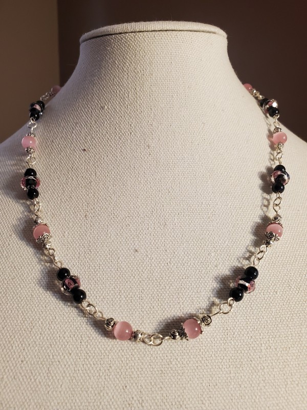 Pink Rose Necklace, Onyx, Lamp Work Beads in Silver , 20" long