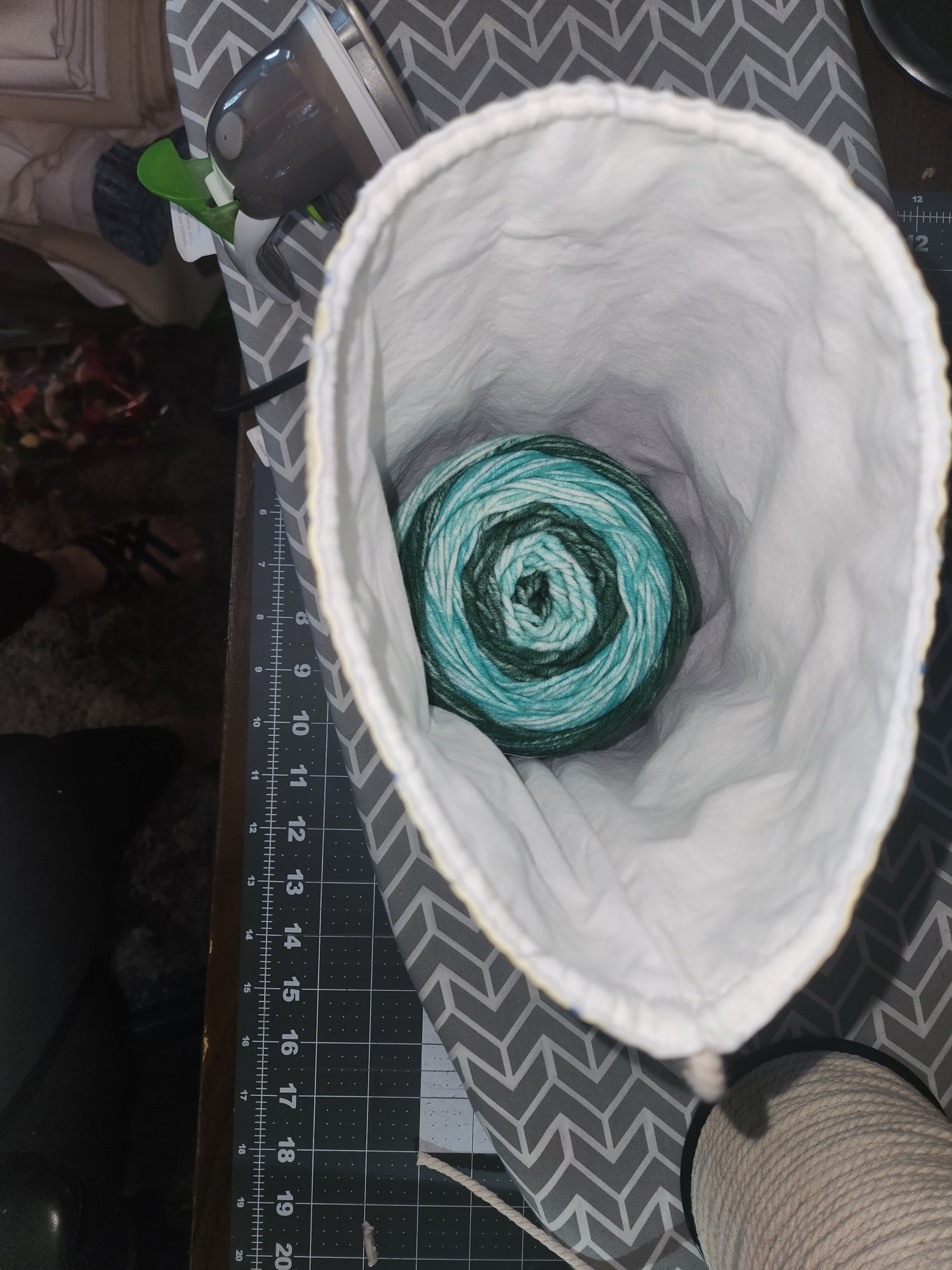 Travel bag dor the yarn enthusiast! Large enough to hold two skeins and keep them clean while you work! Draw string opening relieves the need to remove the skeins while in use. Vast assortment of colors and fabric patterns available.
