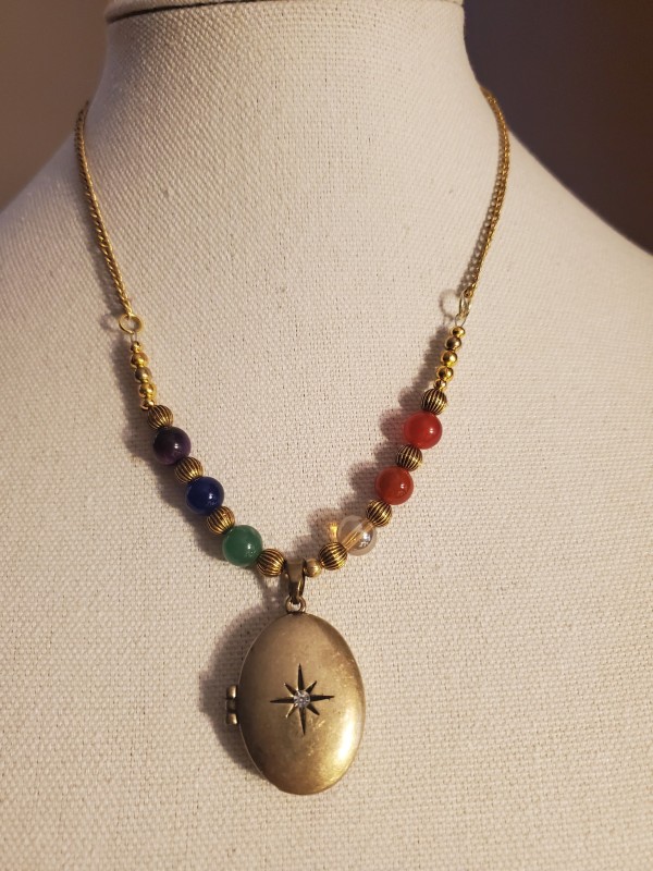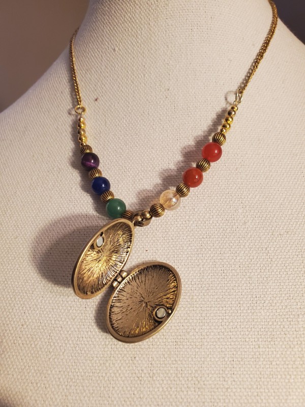 Rainbow Locket Necklace in Agates and Bronze, 18' long, Locket is fully functional