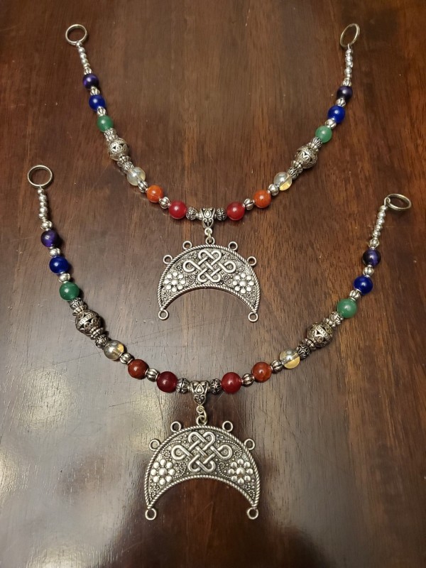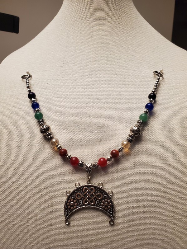 Viking Swag Festoon style with a large Lunula pendant, extender to change into necklace is easily attachable. Agate, Sapphire, Murano Glass, Chrystallized Agate, Carnelian. 6 available.