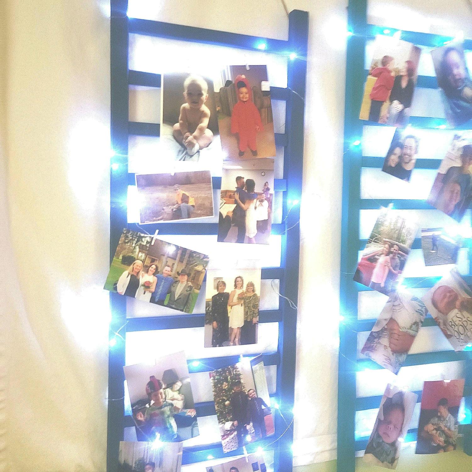 Repurposed Wood Ladder Photo Display: Vintage Crib Frame with Fairy Lights