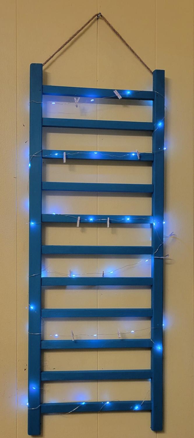 1 of 2 of a kind, handcrafted repurposed solid wood ladder picture frame, from a vintage crib, painted in blue green chalk paint and the other 1 blue, with white fairy lights and tiny white clothes pins to hang your pictures from. Measures 36" tall x 13" wide.