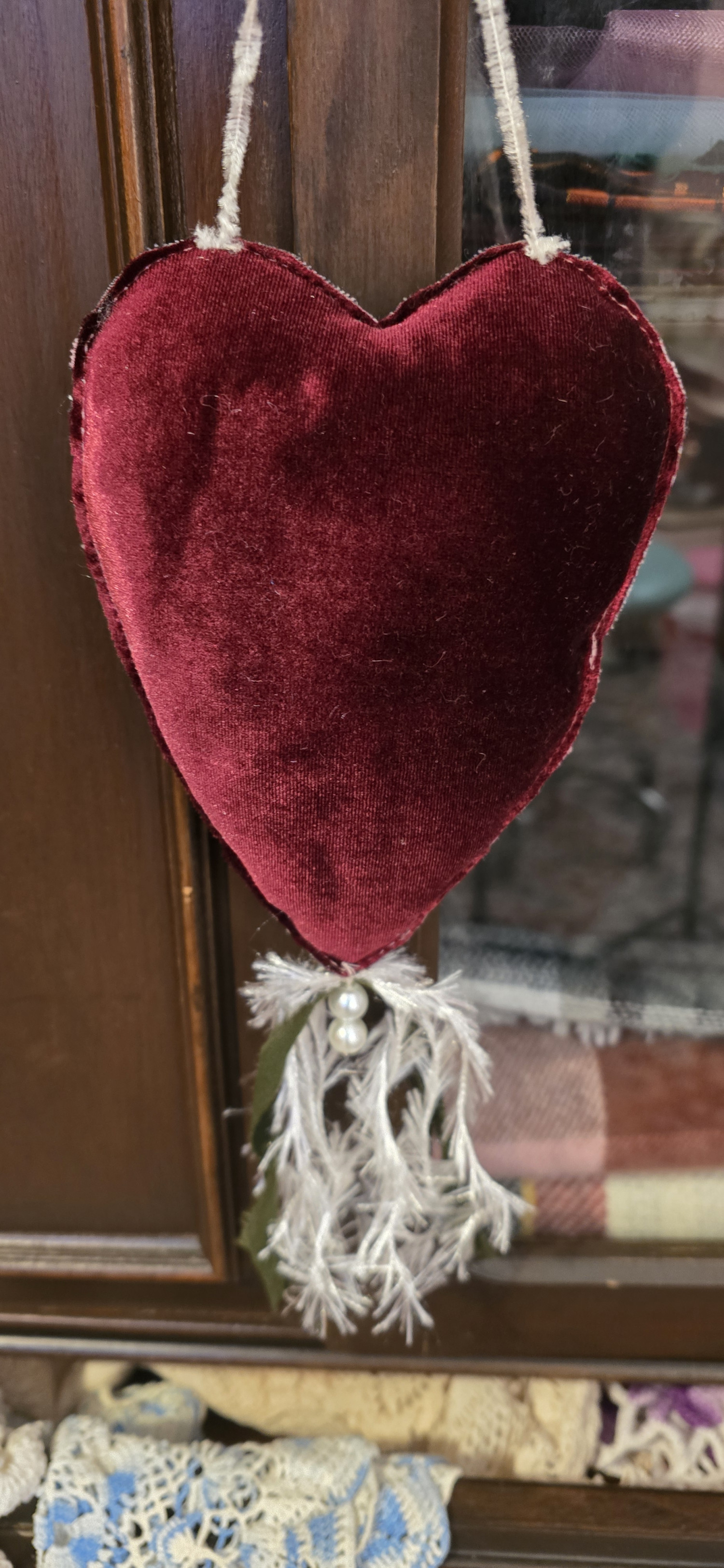 Golden rose with black background on one side, deep red velvet on the other side and embellished with pearls and trim on the bottom.