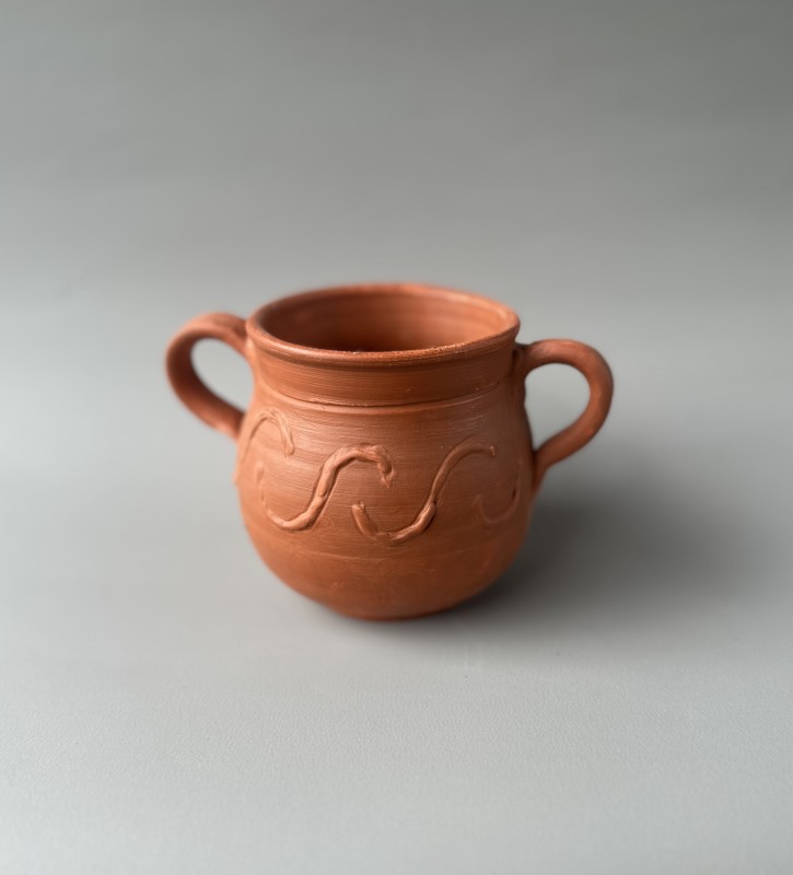 This is a handmade replica of a Samian ware two handled cup. It was thrown on my potters wheel, I attached pulled handles, then piped on slip in a Roman design. After drying I brushed 4 layers of terra sigilatta and burnished with a cloth. It was then fired in my kiln to earthenware temperature. It is not glazed, the brick red color comes from Terra sigillata a fine slip, which becomes hard and waterproof after firing. It contains NO lead nor other harmful chemicals.