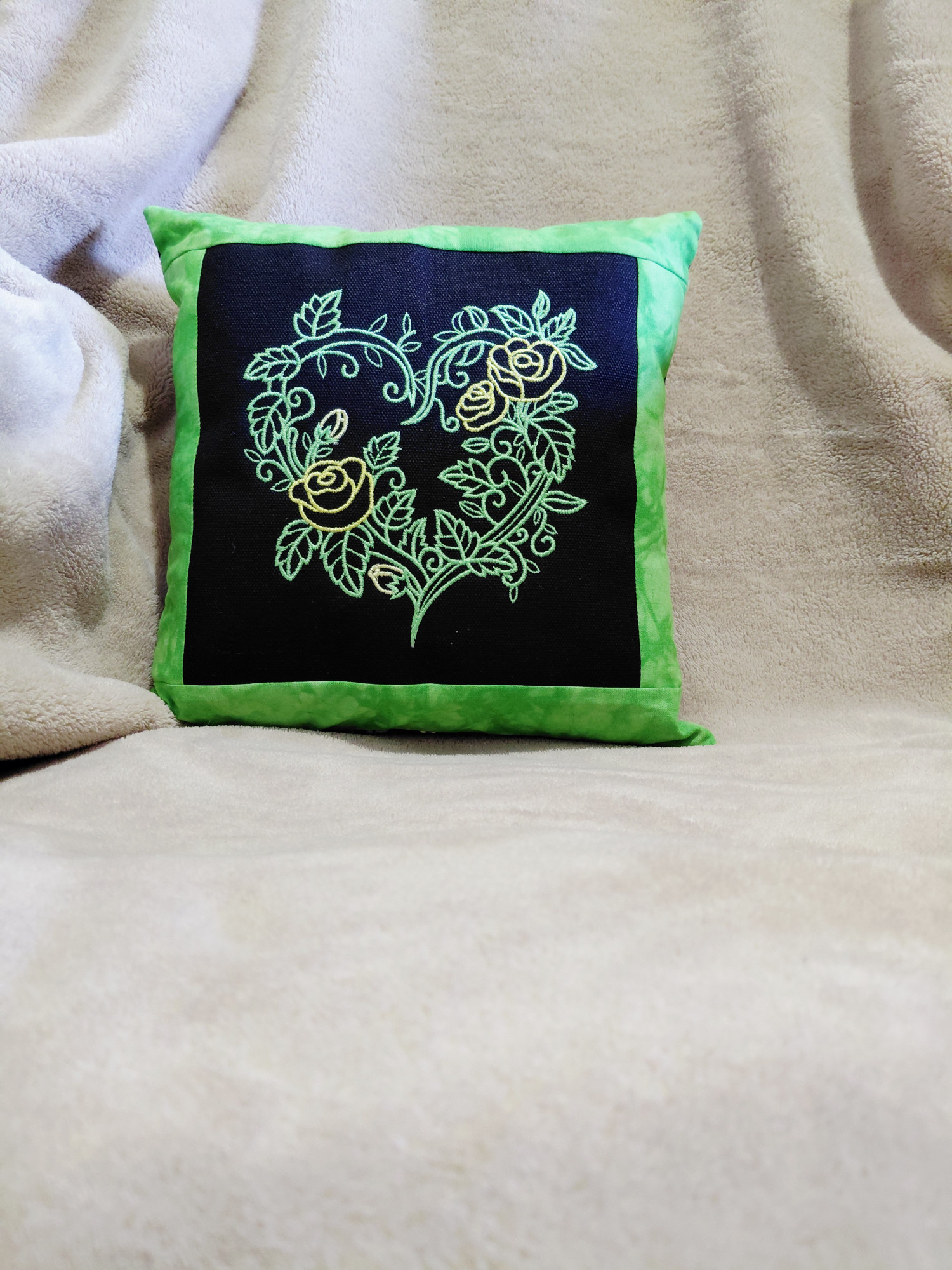 10.5" X 10.5" throw pillow. Made with 100%cotton fabric, 100% canvas, poly-fil stuffing, Rayon embroidery thread.