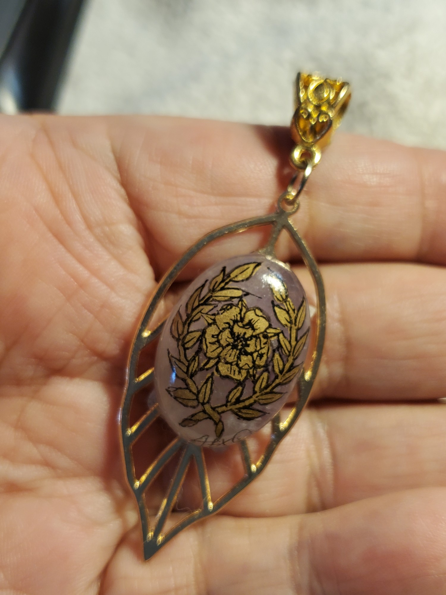 Laurel Rose Pendant, Amethyst, One of a Kind, Crushed Gold Leaf Enamel and outlines painted with a Cat's Whisker