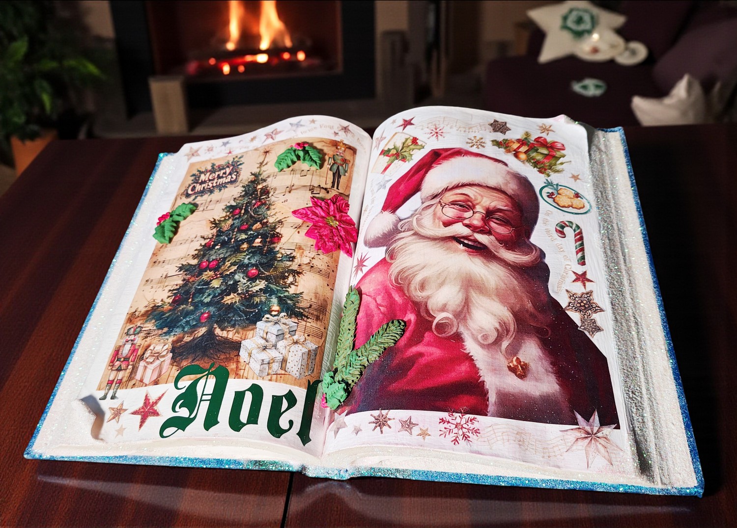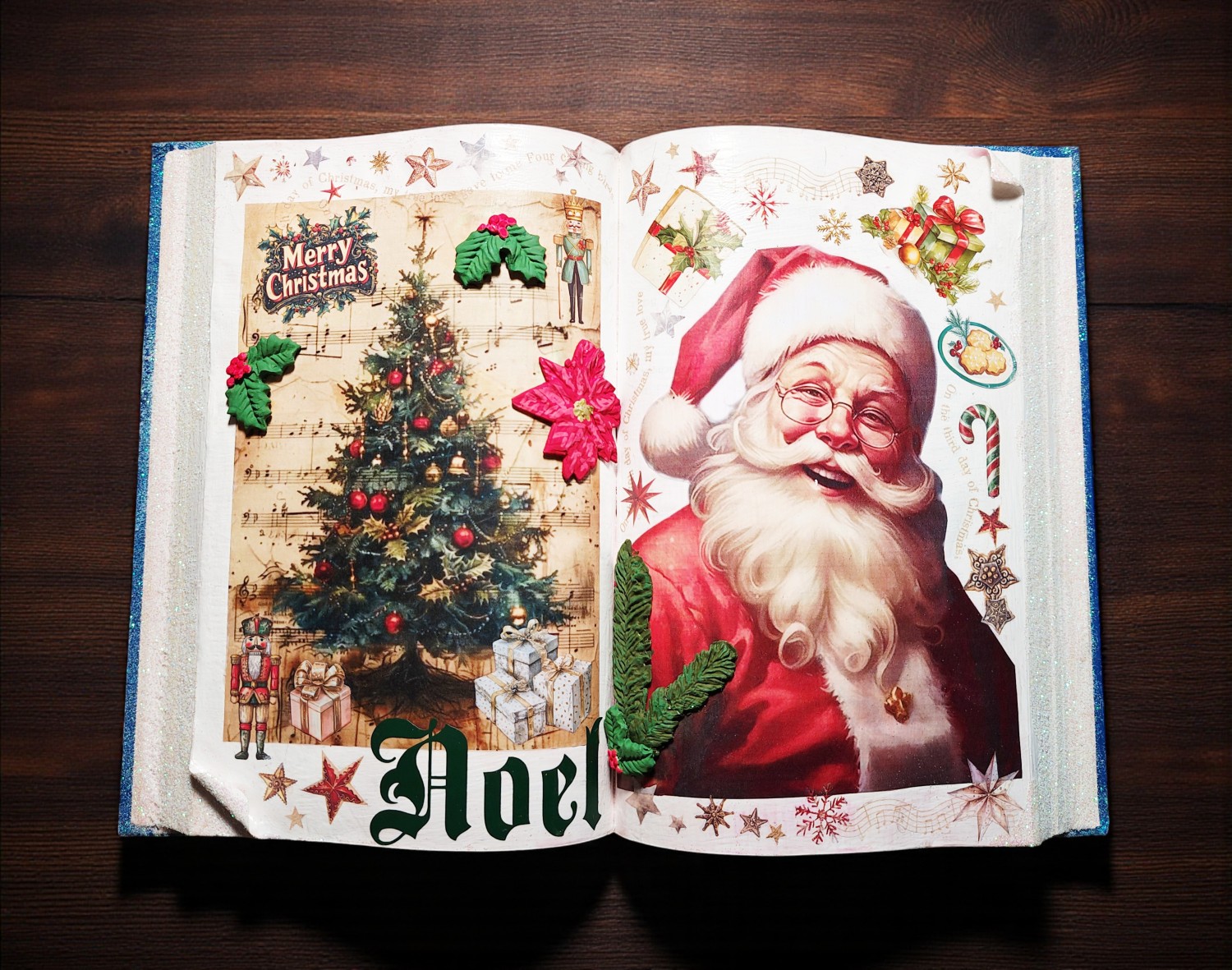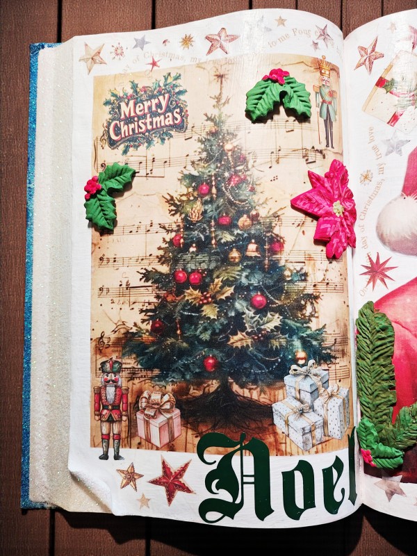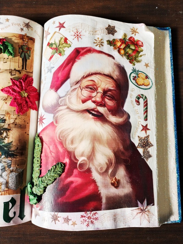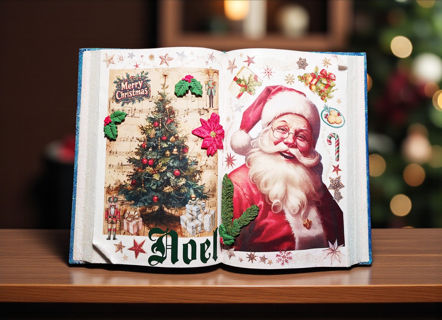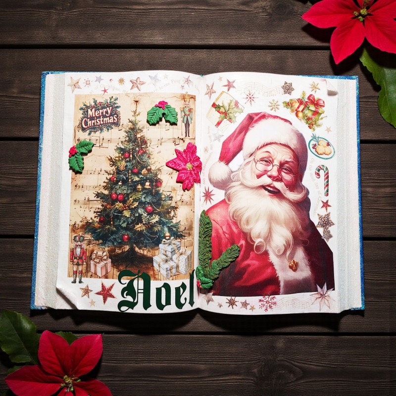 Bring timeless holiday cheer to your home with this beautifully crafted vintage-style Christmas book decoration. Featuring a double-page spread of festive illustrations, this piece evokes the warmth and wonder of classic Christmas storytelling. On one side, a lush evergreen tree sparkles with ornaments, golden beads, and twinkling lights, nestled among musical notes and wrapped gifts. Embellishments like holly leaves, a red poinsettia, and a nutcracker add depth and texture, while the words “Merry Christmas” and “Noel” frame the scene with joyful elegance. Opposite the tree, a cheerful Santa Claus beams with delight, surrounded by candy canes, stars, holly, and presents—all set against a background of musical motifs and celestial sparkle. Measures 9.5" x 13.5".