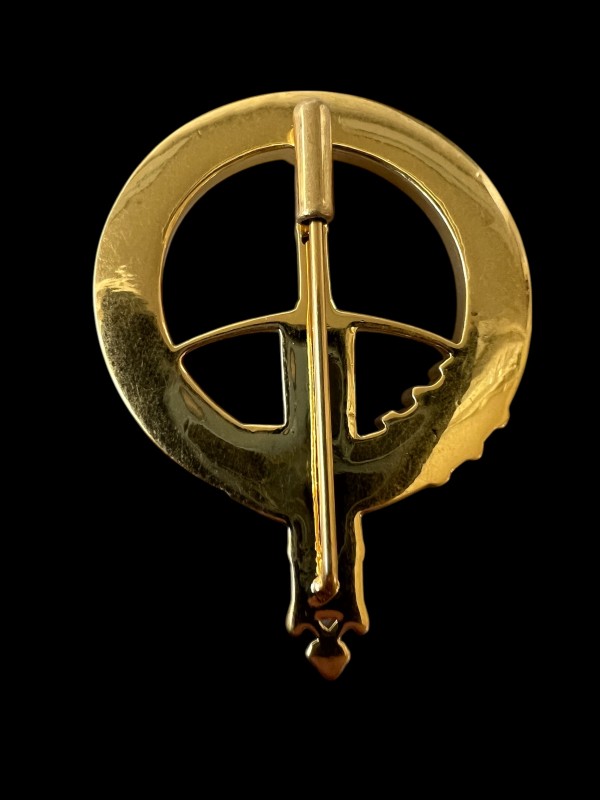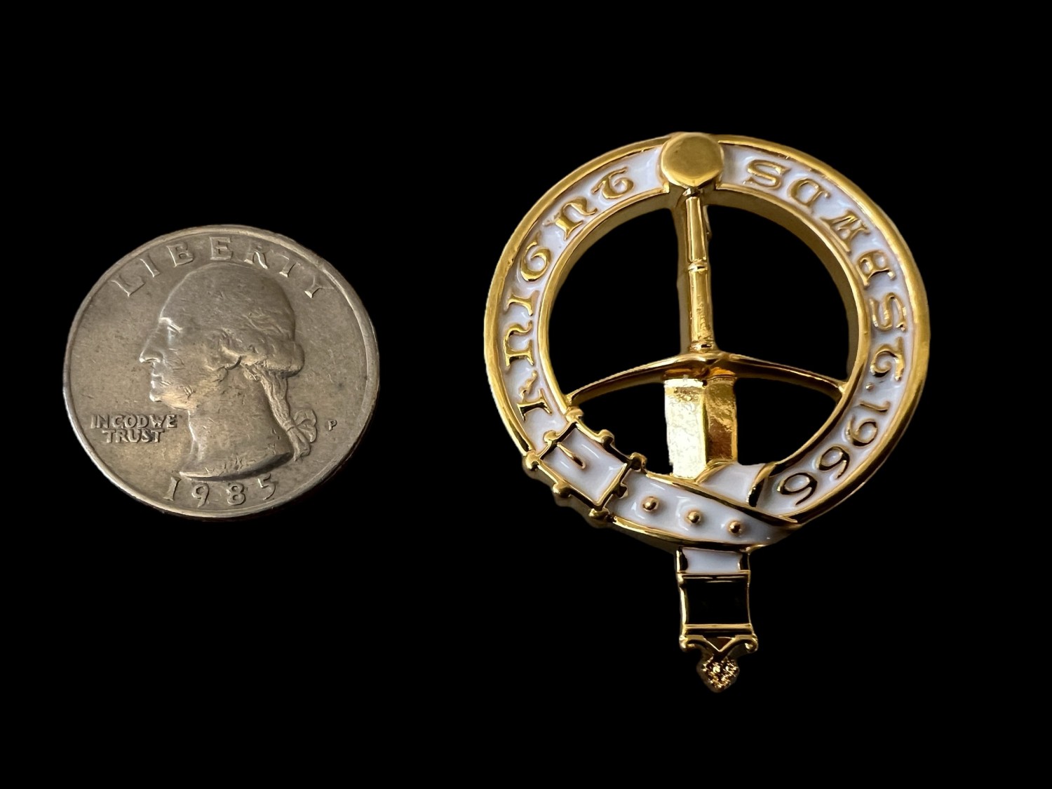 A resin-enamel SCA Knight pin, featuring the words, "Knight, SCA, est. 1966." The whole pin is 1 3/4" long.