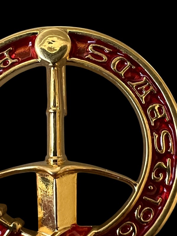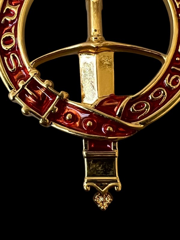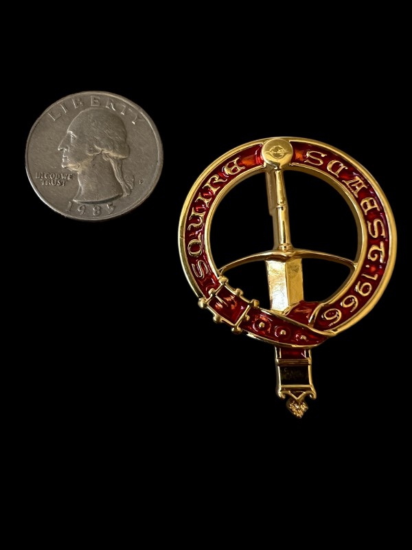 A resin-enamel SCA Knight pin, featuring the words, "Squire, SCA, est. 1966." The whole pin is 1 3/4" long.