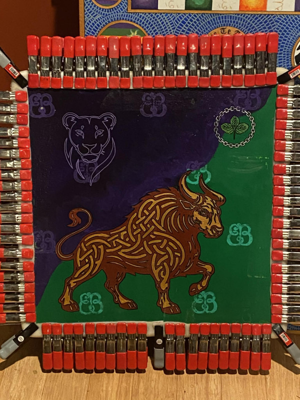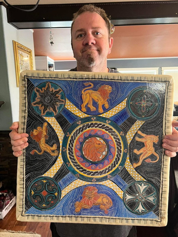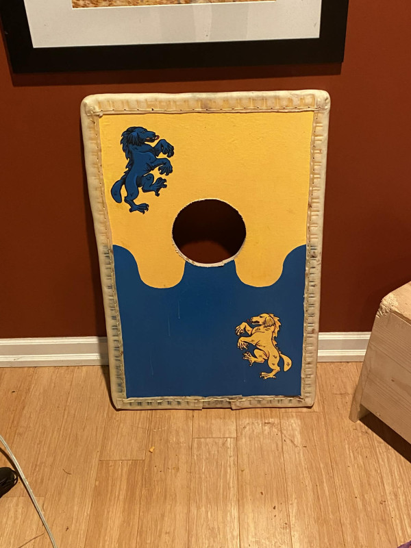 1/2" birch core hard plywood, covered in canvas, with gesso. Rope edging with handstitched rawhide cover.