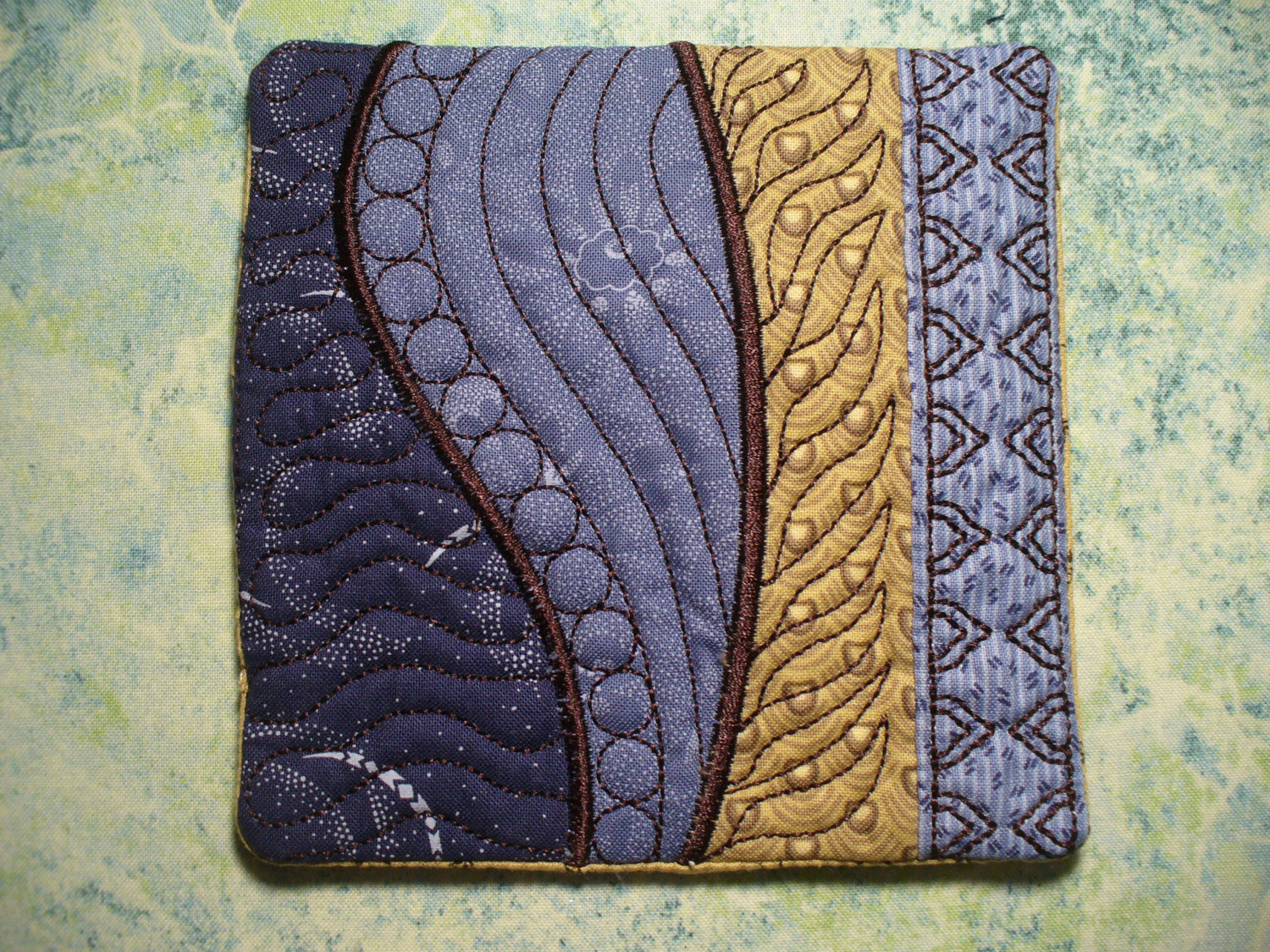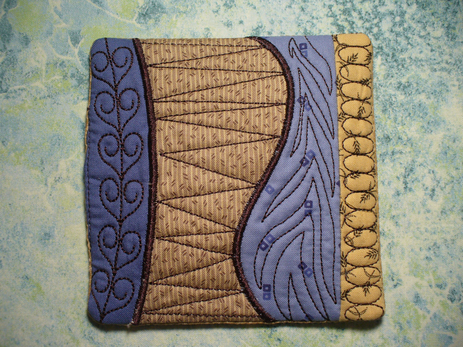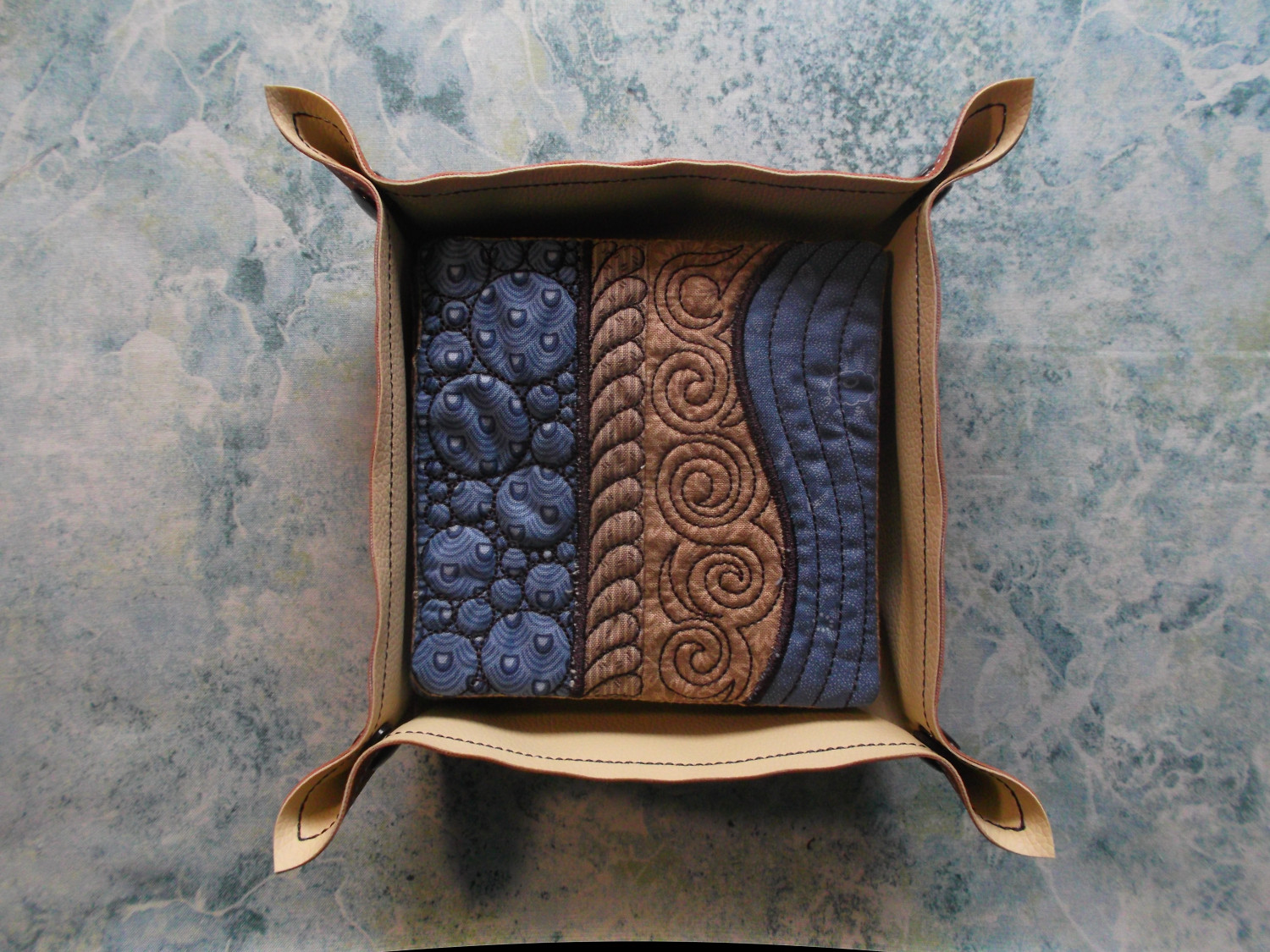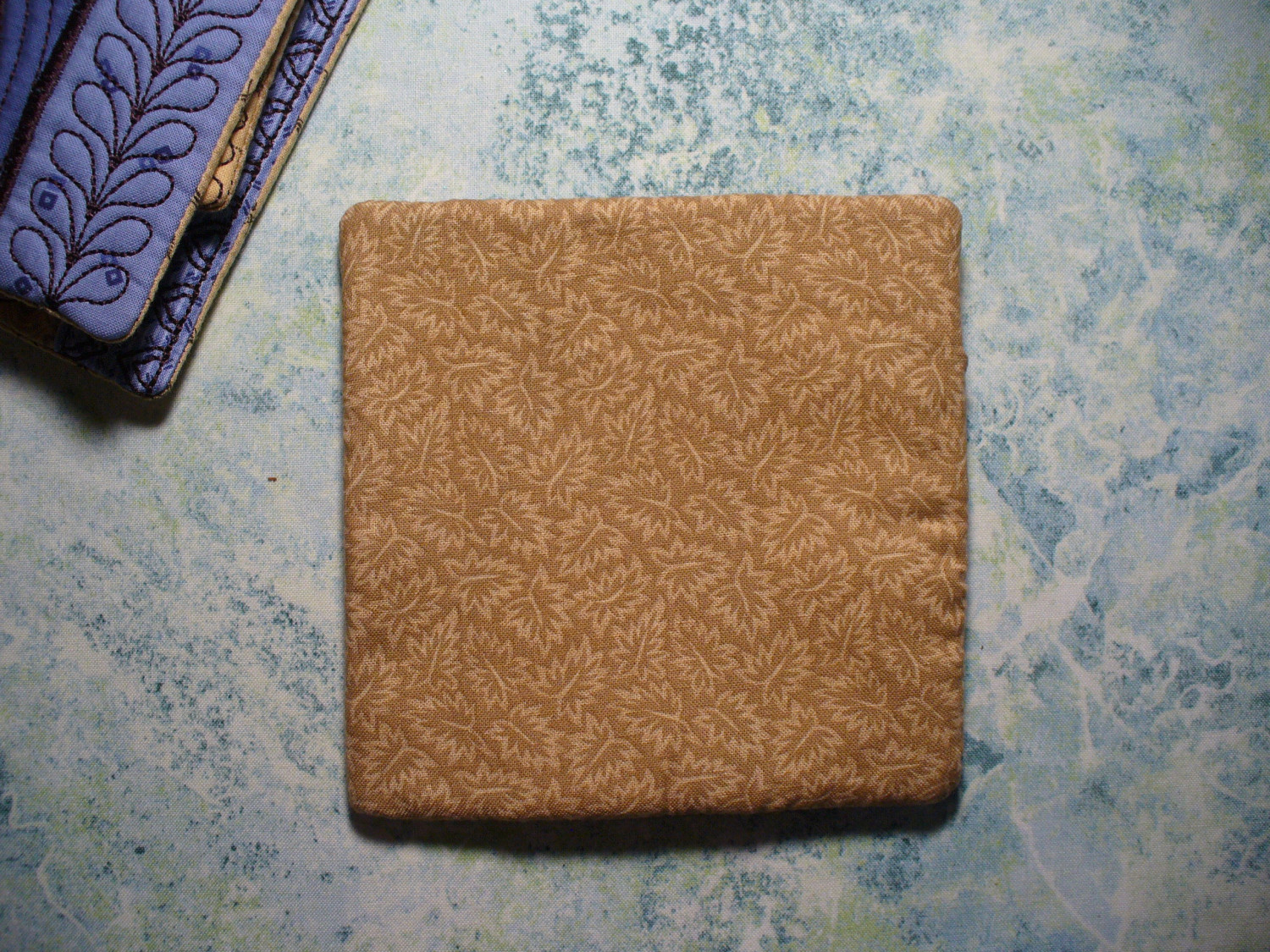 Set of 4 blue and tan 4.75 inches by 4.75 inches coasters. Includes a 8.25" by 8.25" vinyl snap tray.