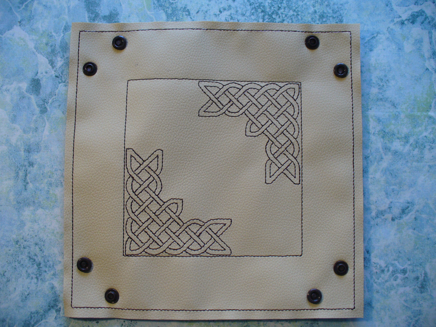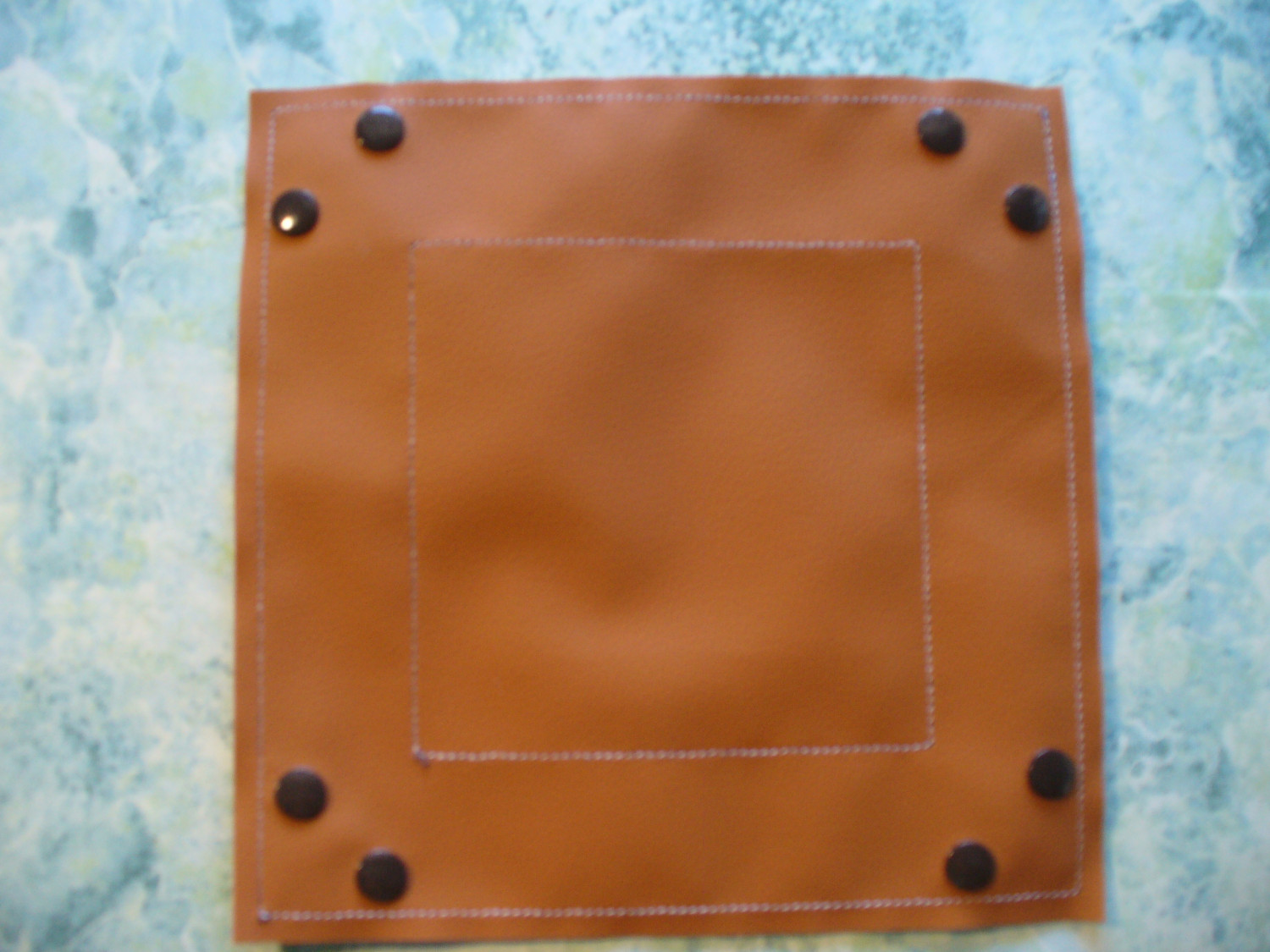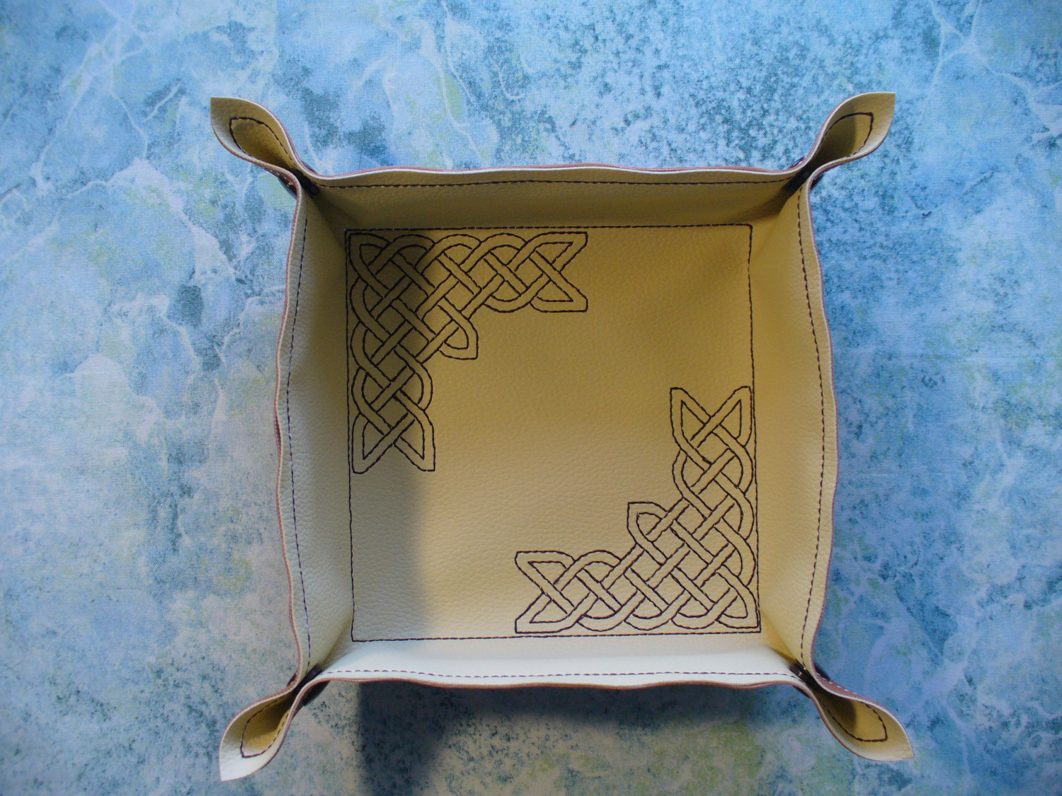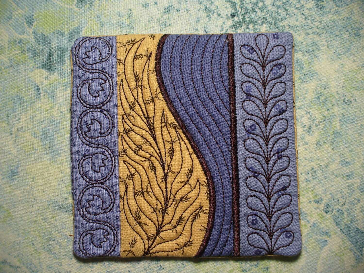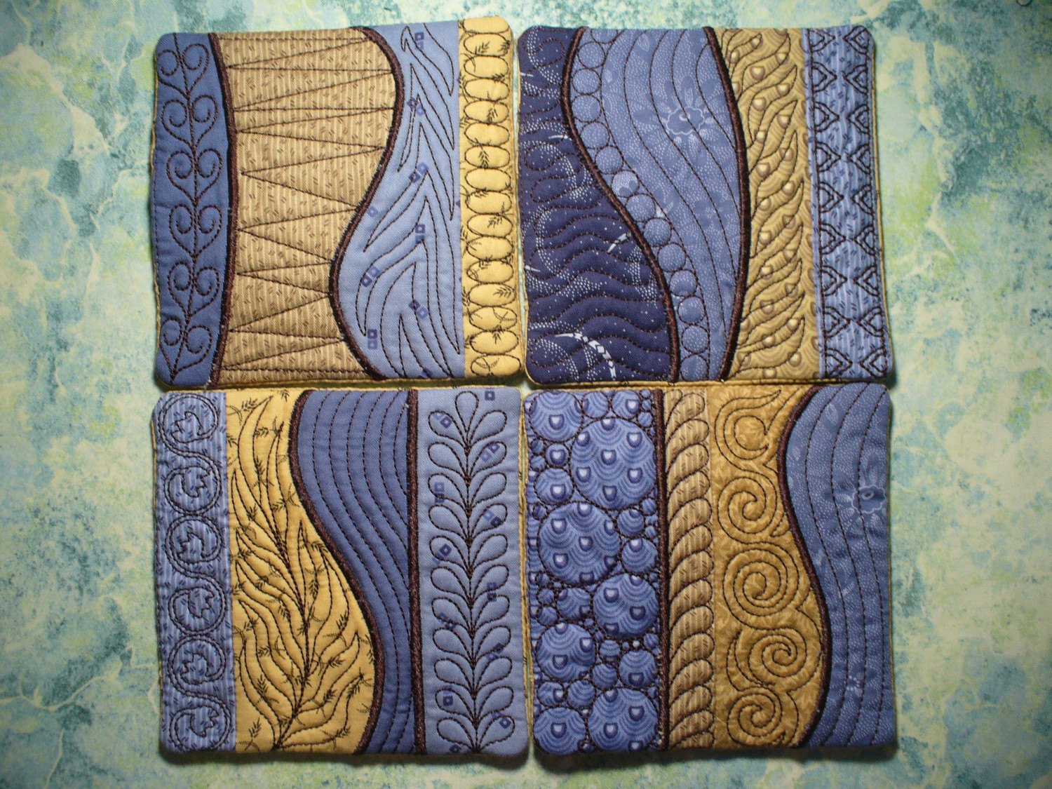 Set of 4 blue and tan 4.75 inches by 4.75 inches coasters. Includes a 8.25" by 8.25" vinyl snap tray.
