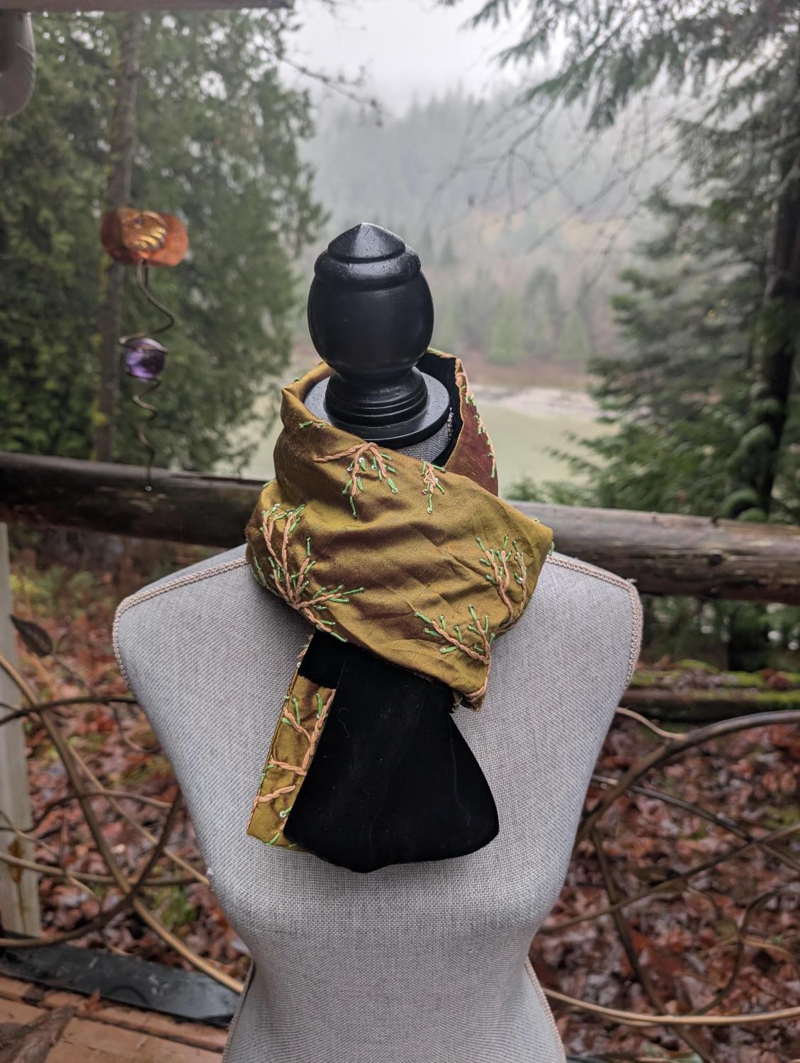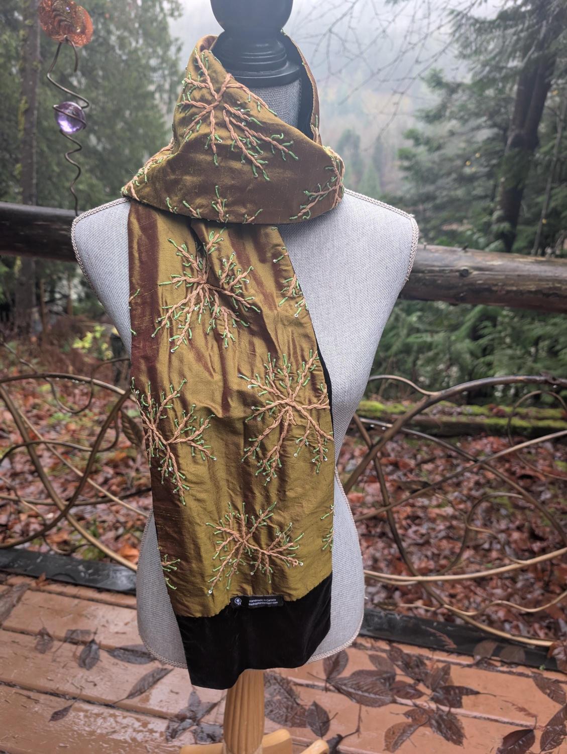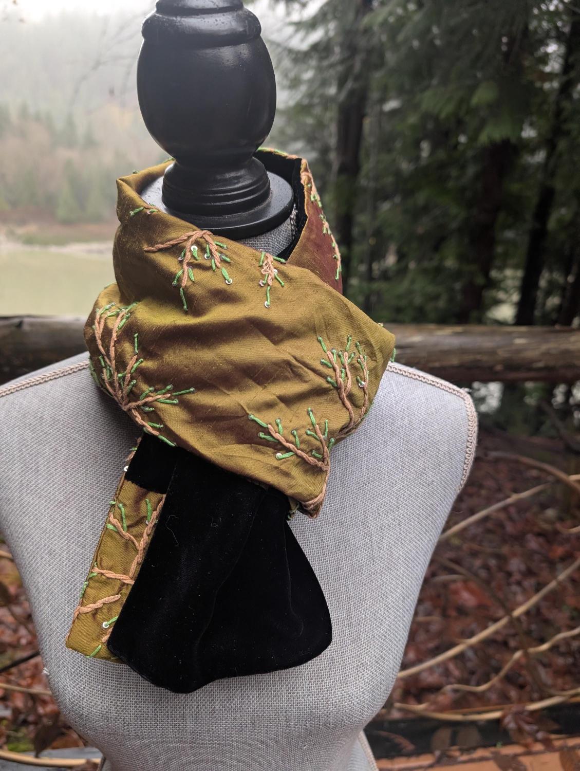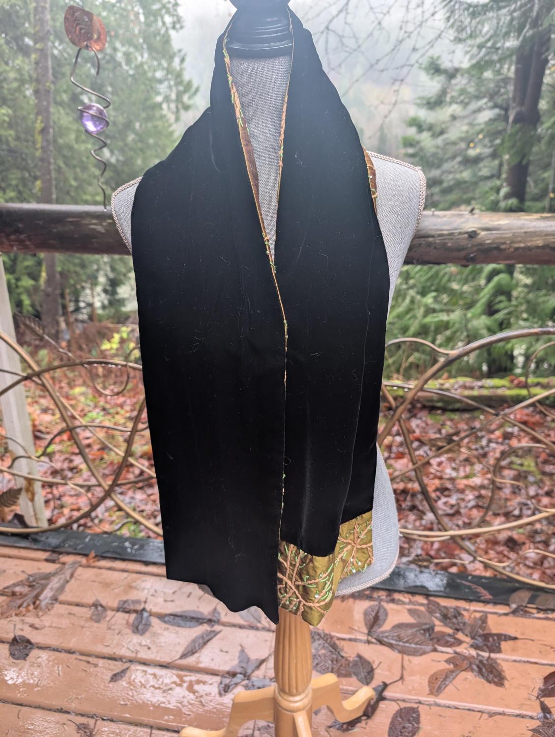 This unique art scarf will turn heads when you wear it. Dress it up or down with jeans it will be a statement piece. Elevate your style with this exquisite hand embroidered silk and velvet scarf, crafted in a stunning blend of black and gold. Designed for comfort and elegance, and sophistication for any season. This unique accessory is perfect for layering and adds a striking pop of color to your wardrobe. Each scarf is a one-of-a-kind, artisanal creation—embracing individuality and timeless charm.  The wool used in this scarf comes from a sheep named Cody.