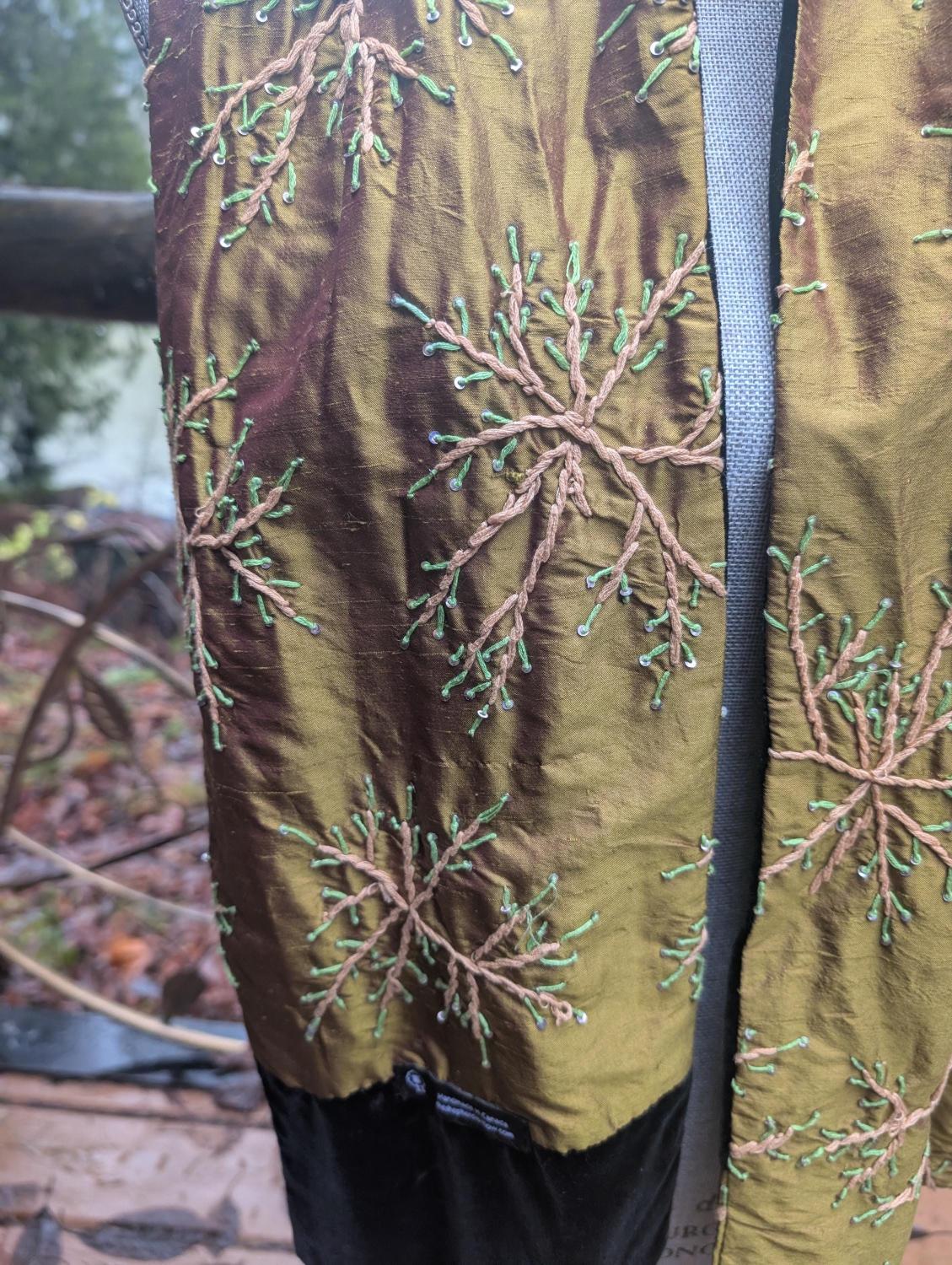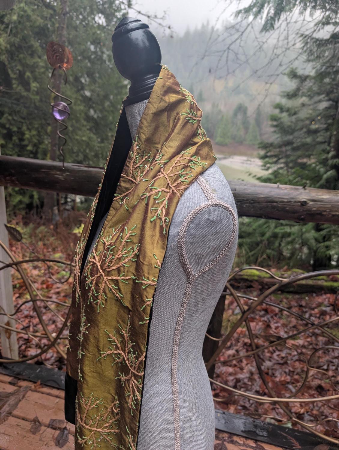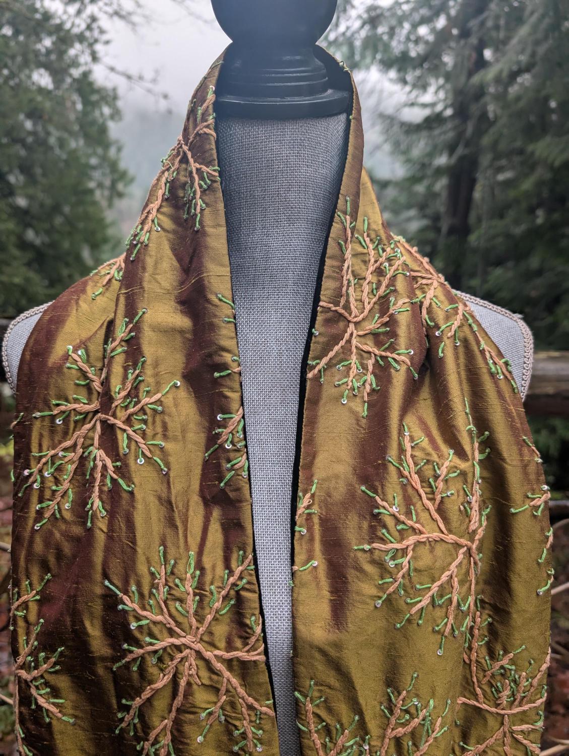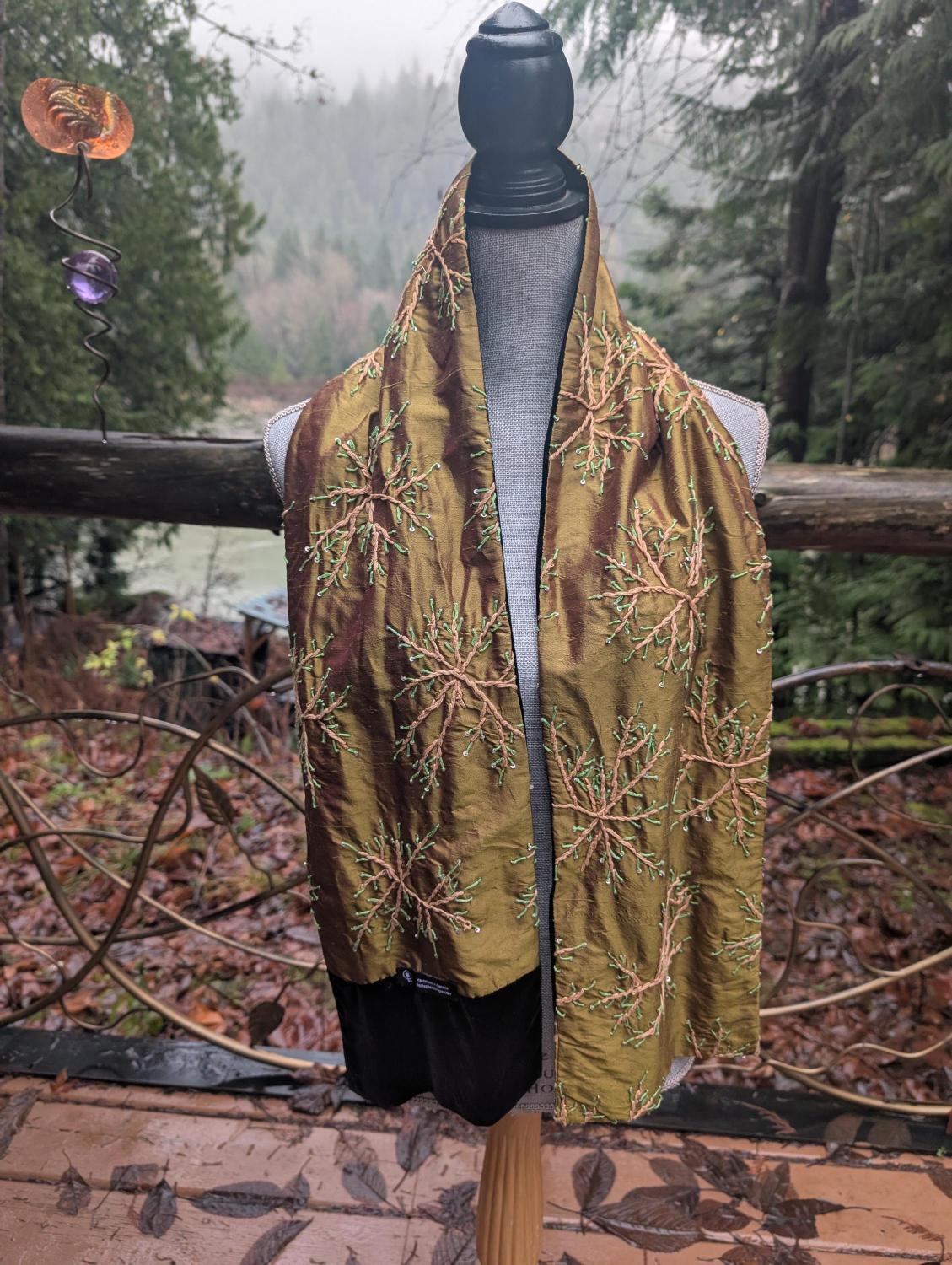 This unique art scarf will turn heads when you wear it. Dress it up or down with jeans it will be a statement piece. Elevate your style with this exquisite hand embroidered silk and velvet scarf, crafted in a stunning blend of black and gold. Designed for comfort and elegance, and sophistication for any season. This unique accessory is perfect for layering and adds a striking pop of color to your wardrobe. Each scarf is a one-of-a-kind, artisanal creation—embracing individuality and timeless charm.  The wool used in this scarf comes from a sheep named Cody.