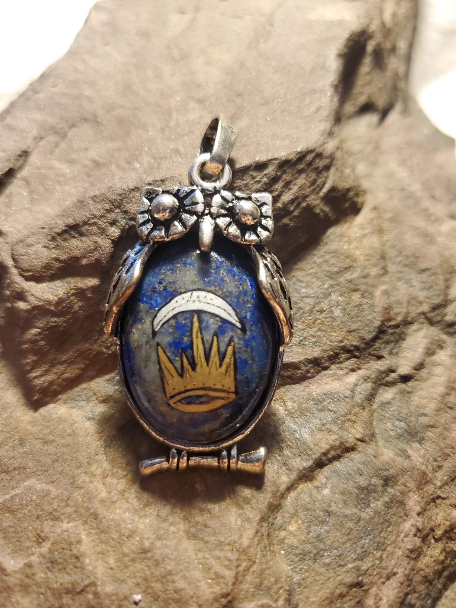 Silver Crescent East Kingdom Owl in Lapis Lazuli and Tibetan Silver