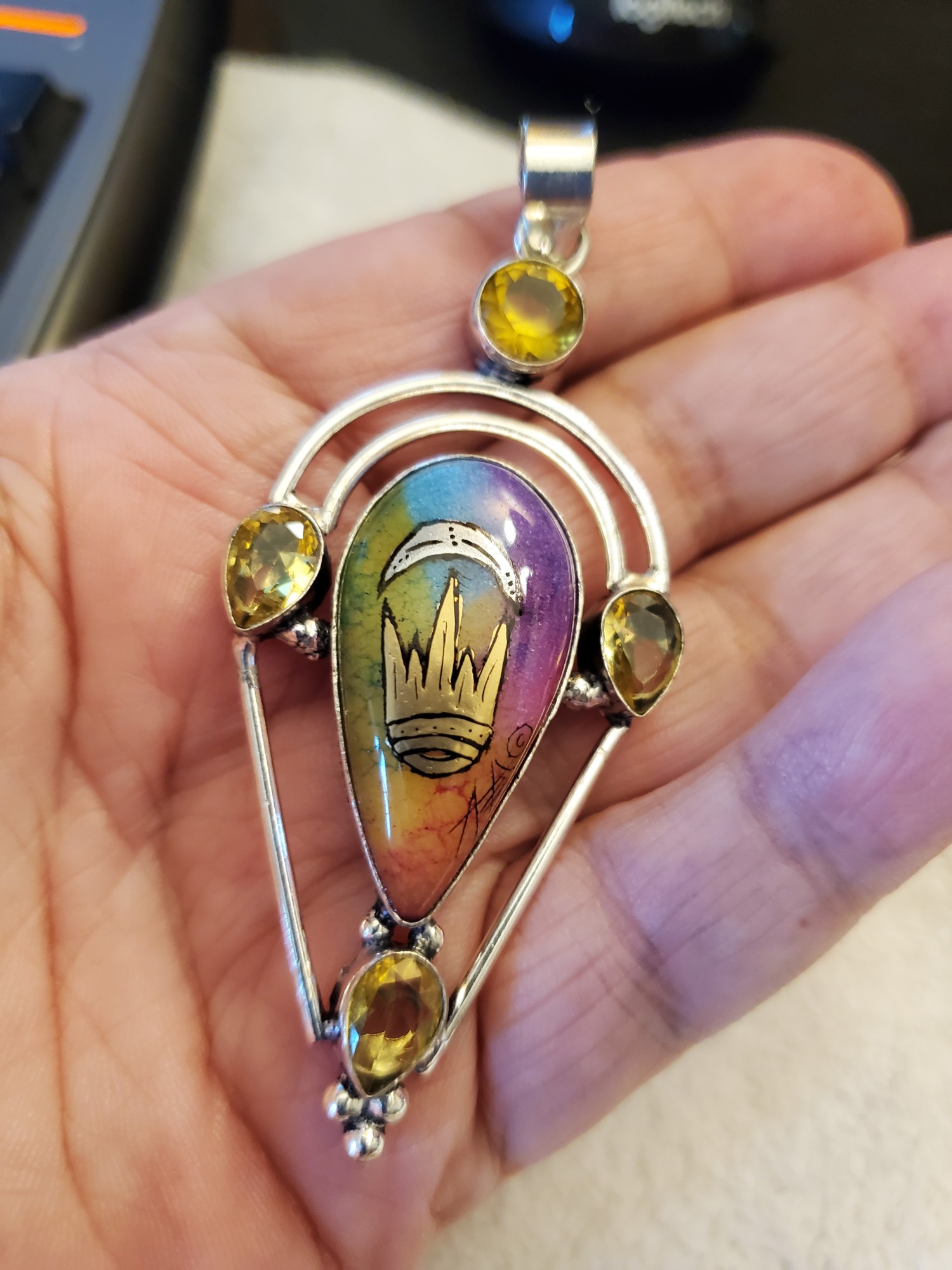 Silver Crescent, East Kingdom , Solar Quartz in Copper, Citrines, One of a Kind, Crushed gold leaf enamel and outlined with a cat's whisker .