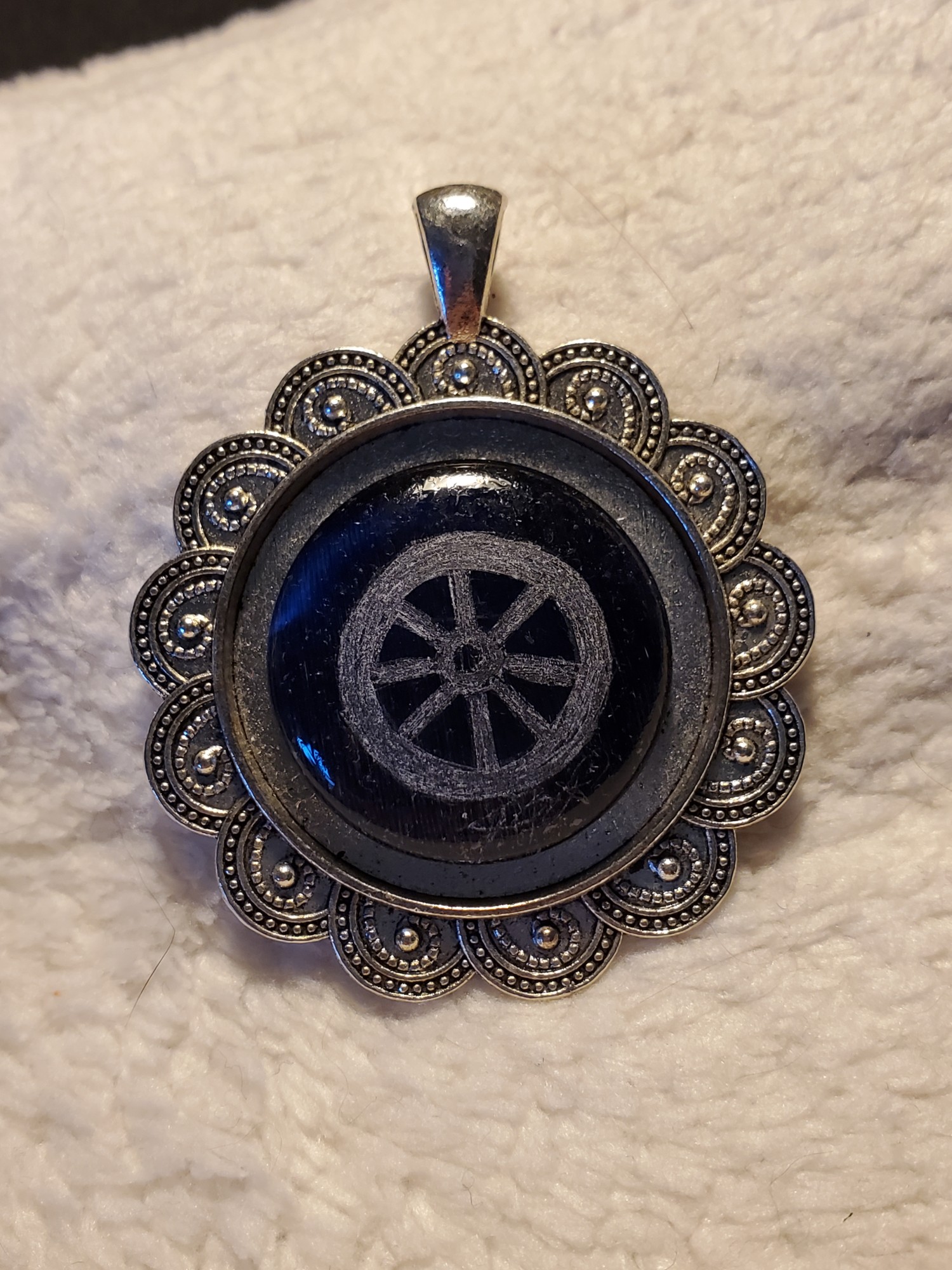 Silver Wheel Intaglio PendantGlass in Tibetan Silver, One of a Kindhand carved#ATSGalleries, #AlextheScribe, #drifasleap, #handmadejewelry, #handmadewithlove, #jewelryofinstagram, #SCA, #SilverWheel, #eastkingdom, #handcarved, #intaglio