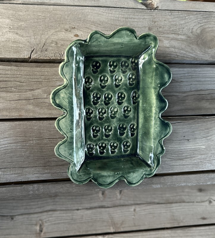 Handmade tray for serving candy, nuts, or anything you wish as it is food safe and sturdy. I mixed the glaze myself. It is decorated with little skulls from a stamp I made myself. This is a one-of-a-kind piece. It is 9 in. long, 7 in. wide, and an inch tall.