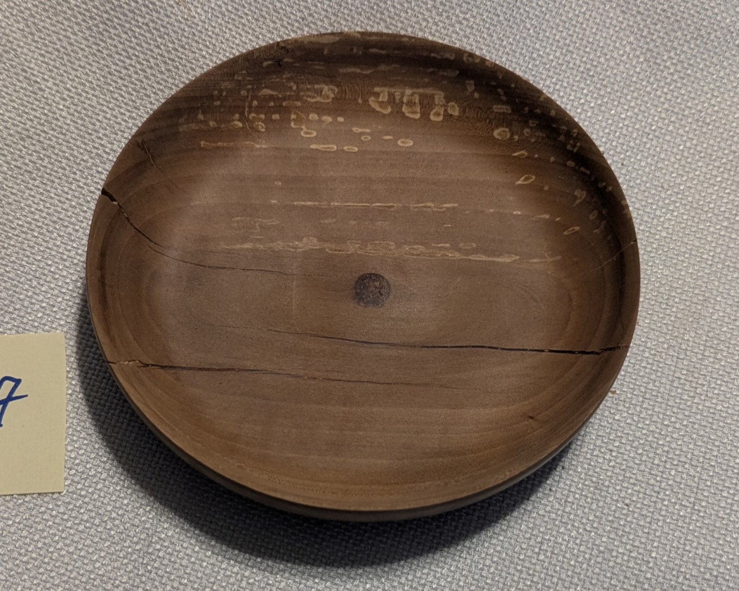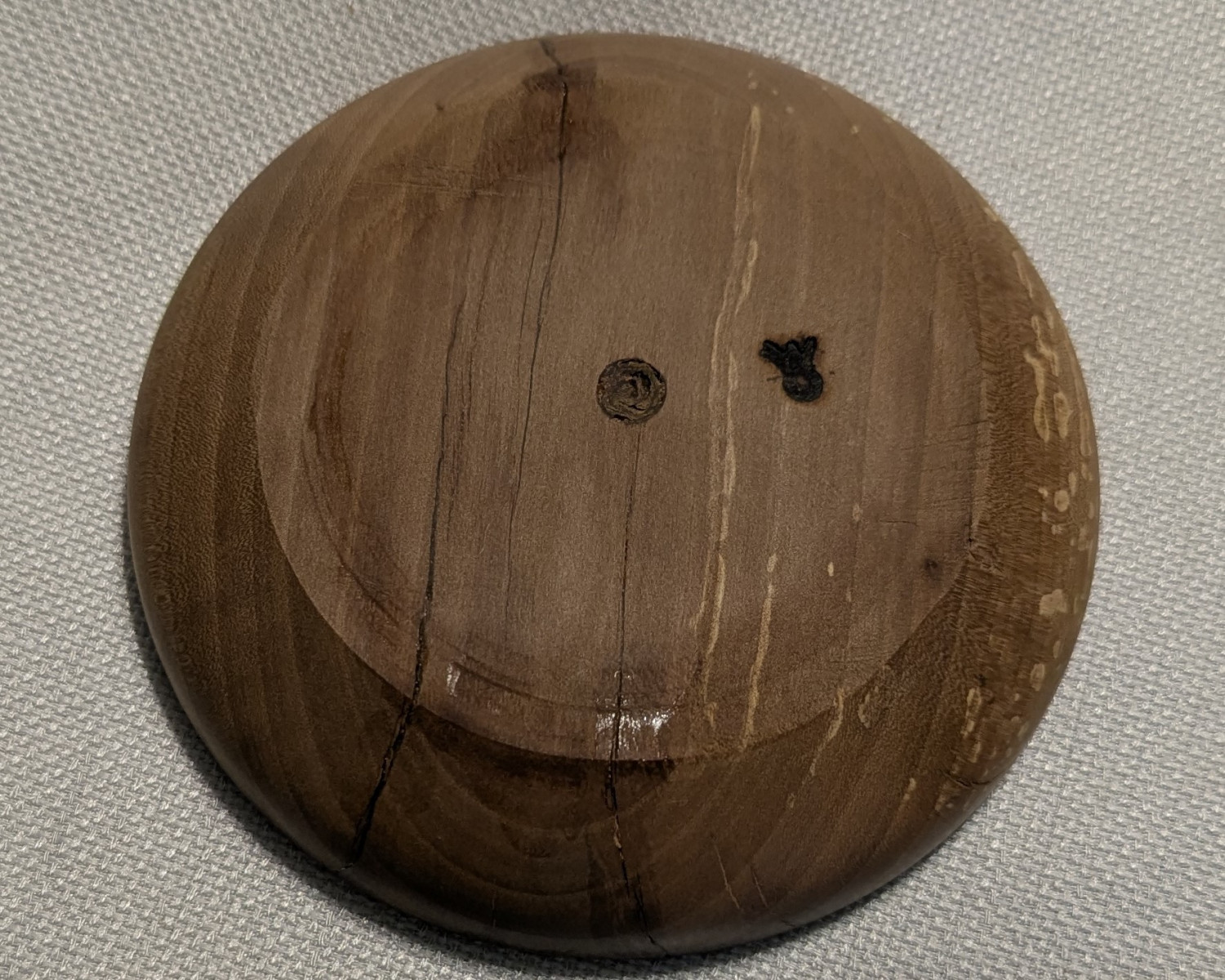 Beautiful grain with some speckling; seams and "funnel hole" in center filled with CA glue; finished with food-grade mineral oil. Approx. 5" wide and 1" tall.