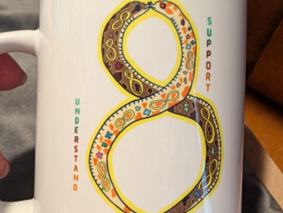 This 15-ounce white ceramic coffee mug features unique Ausome Alicorn digital artwork of two hognose snakes forming an infinity autism symbol. Because each mug is made to order, the photos represent the product but may not match the exact item you receive.
