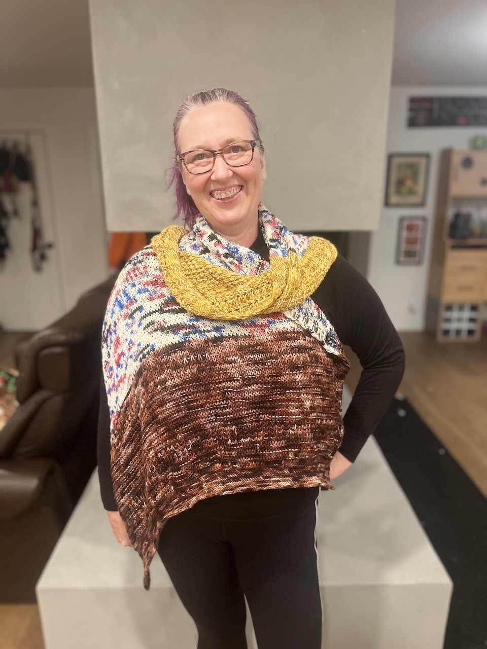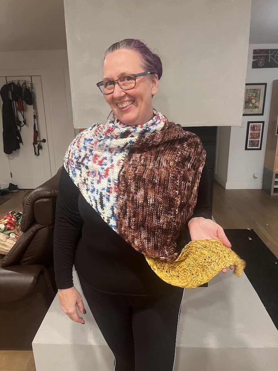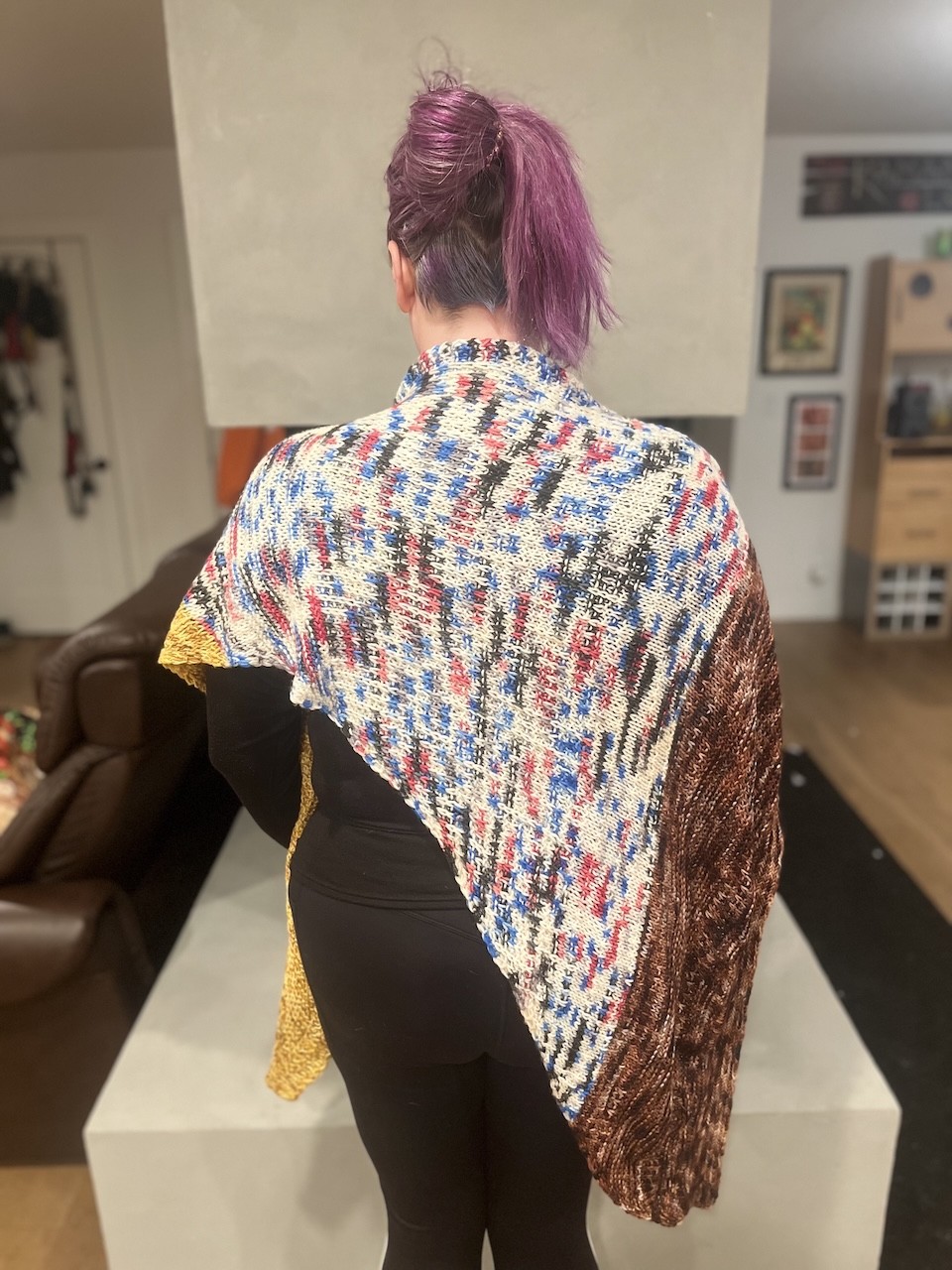 This oversized triangular shawl features interesting slipped stitch textures with a border of Herringbone Stitch that travels along the side edge. Yarn used in colorways inspired by your favorite walking carpet, and some sassy robots.