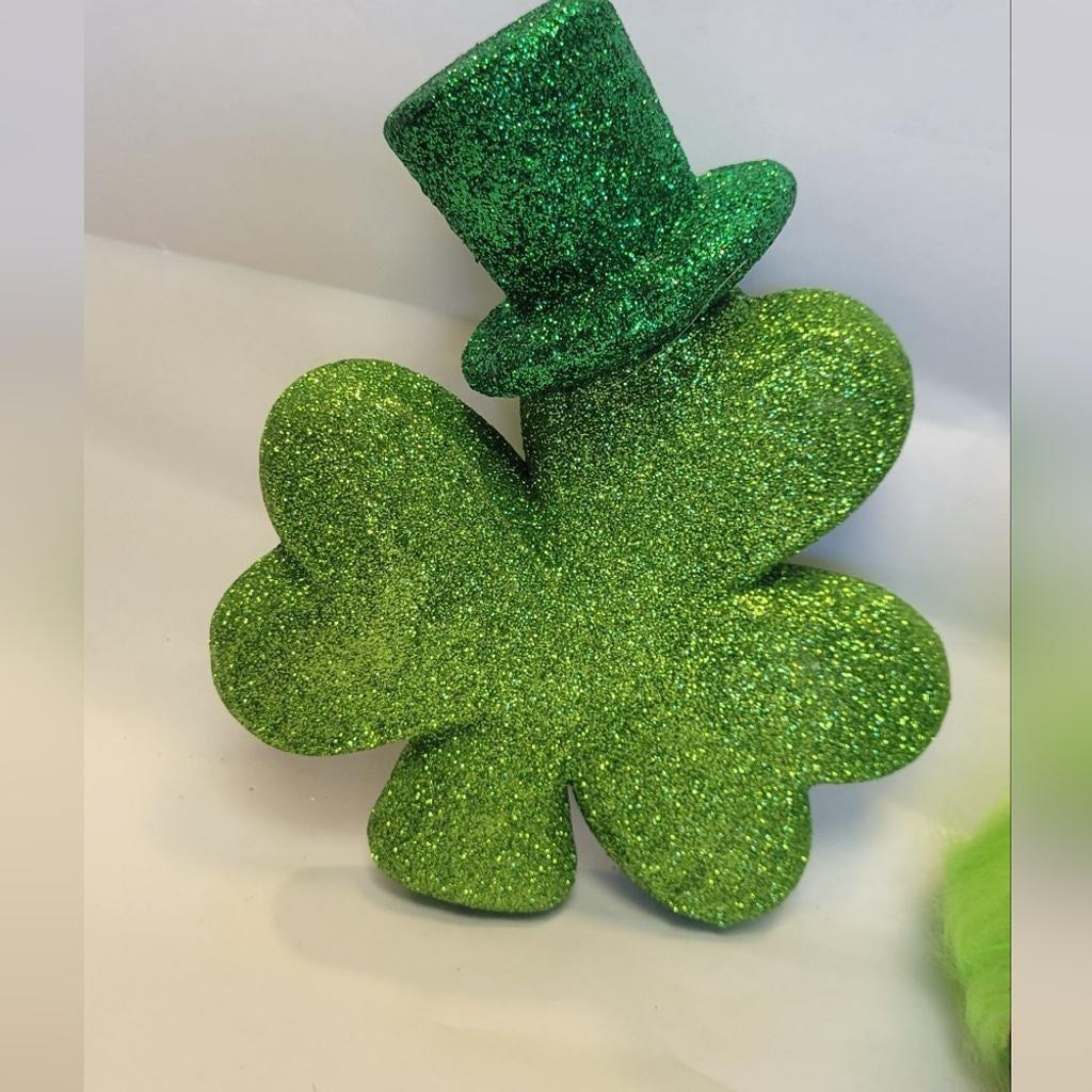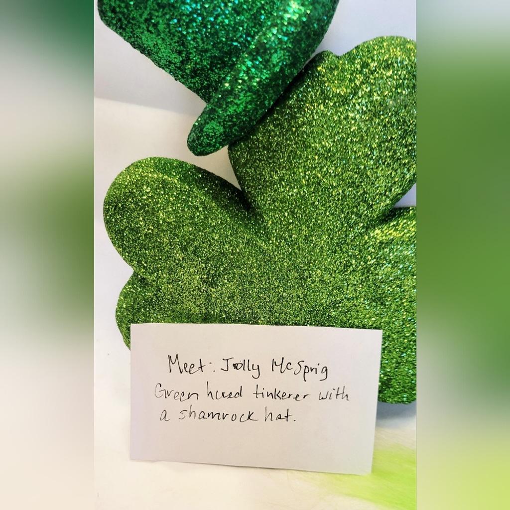 Meet Jolly McSprig, the green-hued tinkerer with a shamrock-tipped hat. Jolly is handmade with premium materials and weighted for stability. He's decked out in a black with acid green shamrock sock, with a glitter shamrock on the tip of his hat, wood nose, and flowing matching green beard made from thick faux fur. He stands approximately 5" tall and 7" to the tip of his shamrock x 3" w x 2.5" d. He comes with the large shamrock and hat decor.