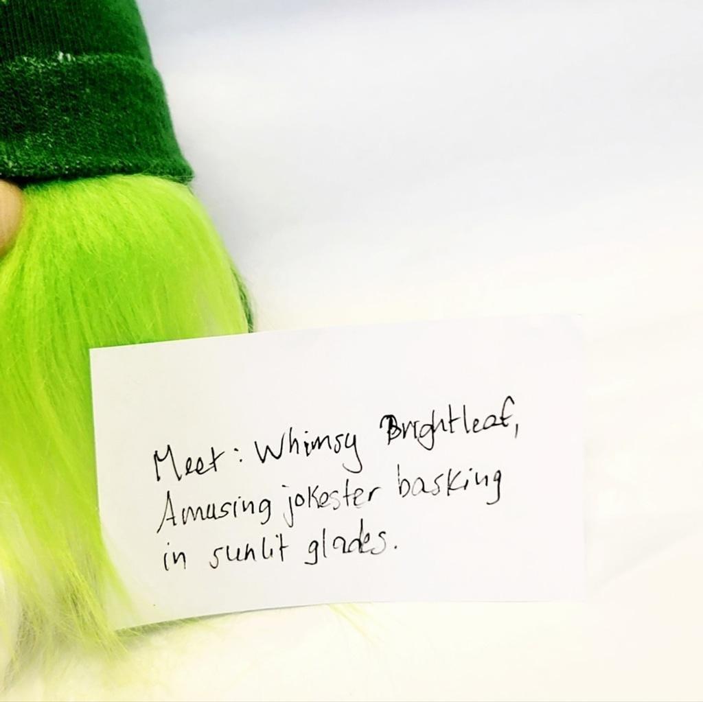 Meet Whimsy Brightleaf, the amusing jokester basking in sunlit glades. Whimsy is made from premium materials and is weighted for stability. He is decked out in an acid green shamrock sock, with a matching hat and pompom, wood nose, and flowing two-tone green and white beard. He stands approximately 5" tall and 8" tall to the tip of his pompom x 3" w x 2.5" d. He comes with the top hat and gold coin decor.