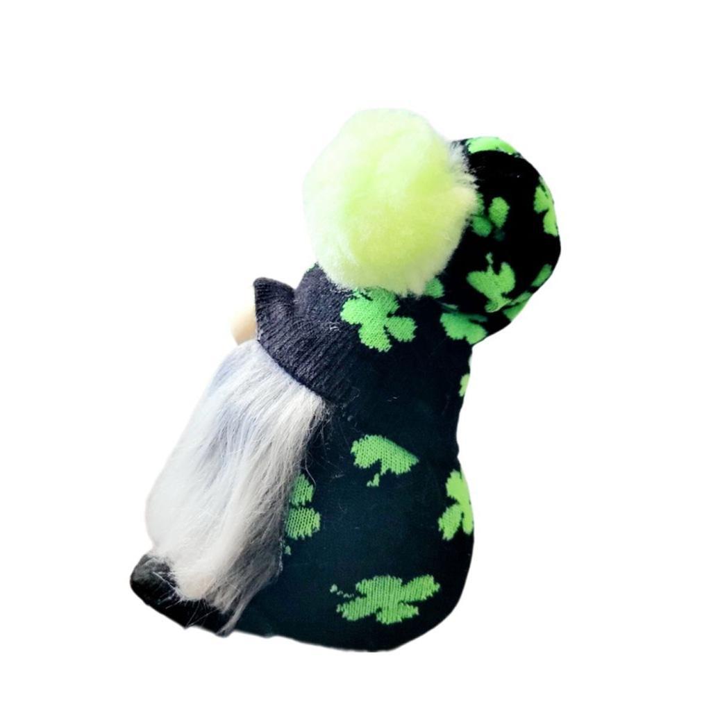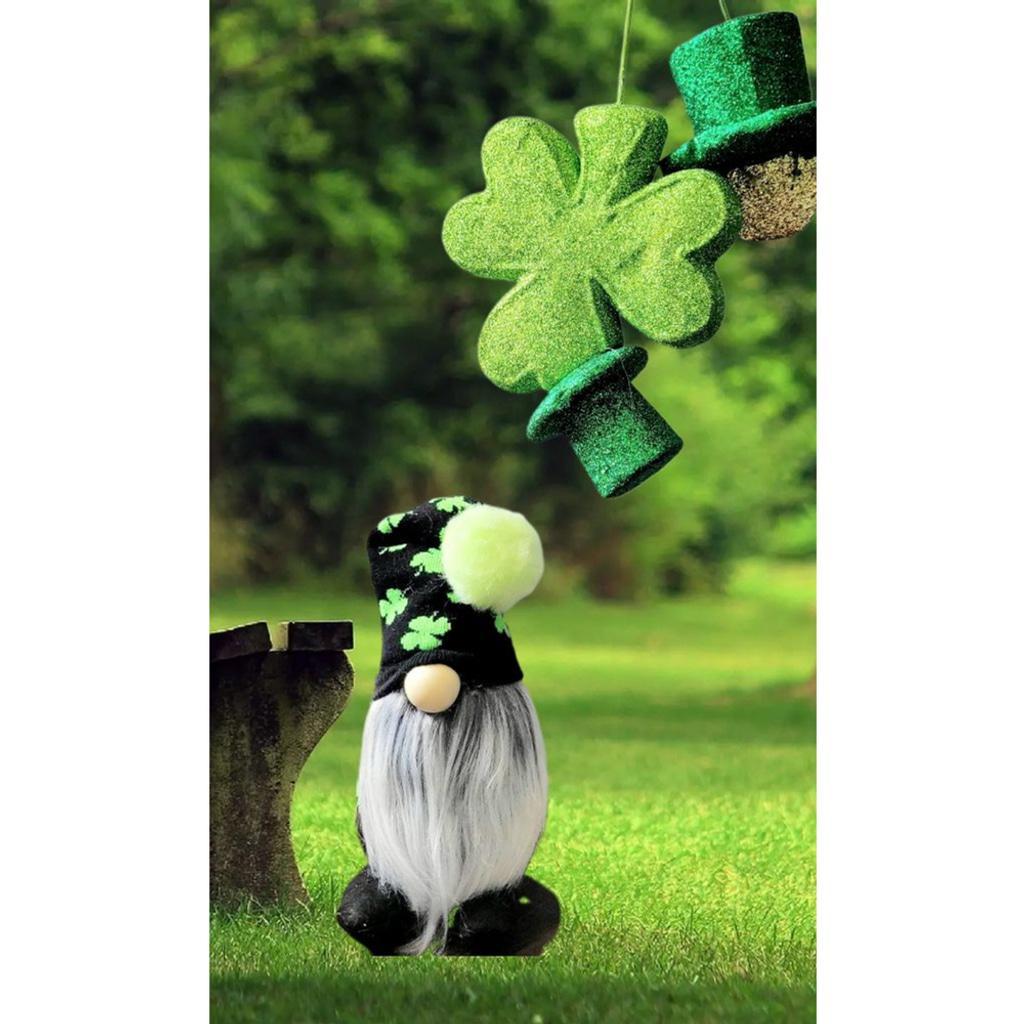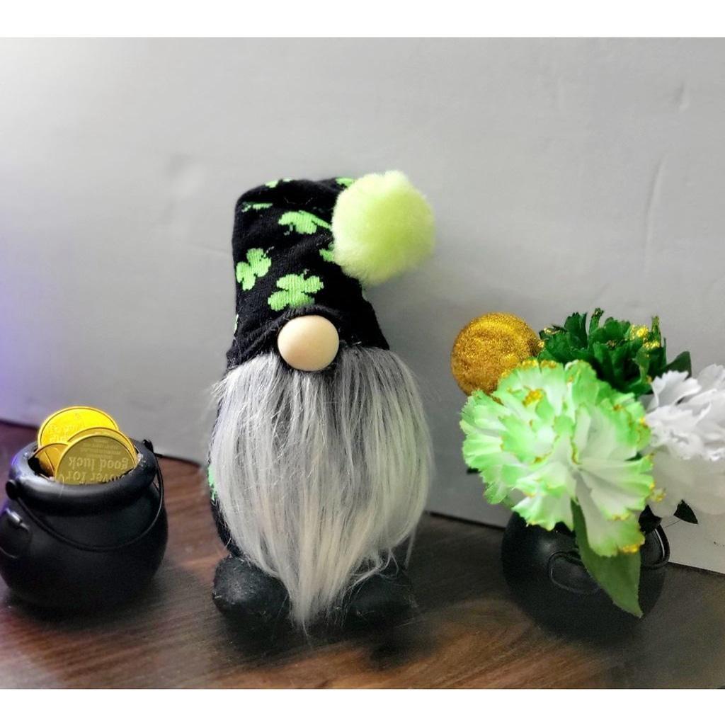 Hand crafted St Patrick's Day Leprechaun Gnome, with a black body with green shamrocks and matching hat, black boots, fluffy green pom pom adorning his hat, wooden nose, and flowing black and gray beard. He measures approximately 8" tall. Comes with a plastic black pot filled with shamrock coins. Perfect as a gift, St Patrick's Day decor, tiered tray, or Rae Dunn decor.