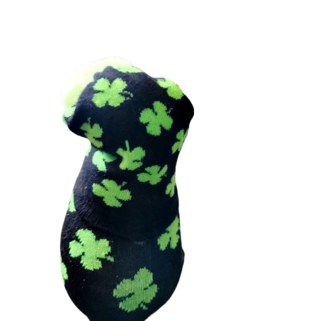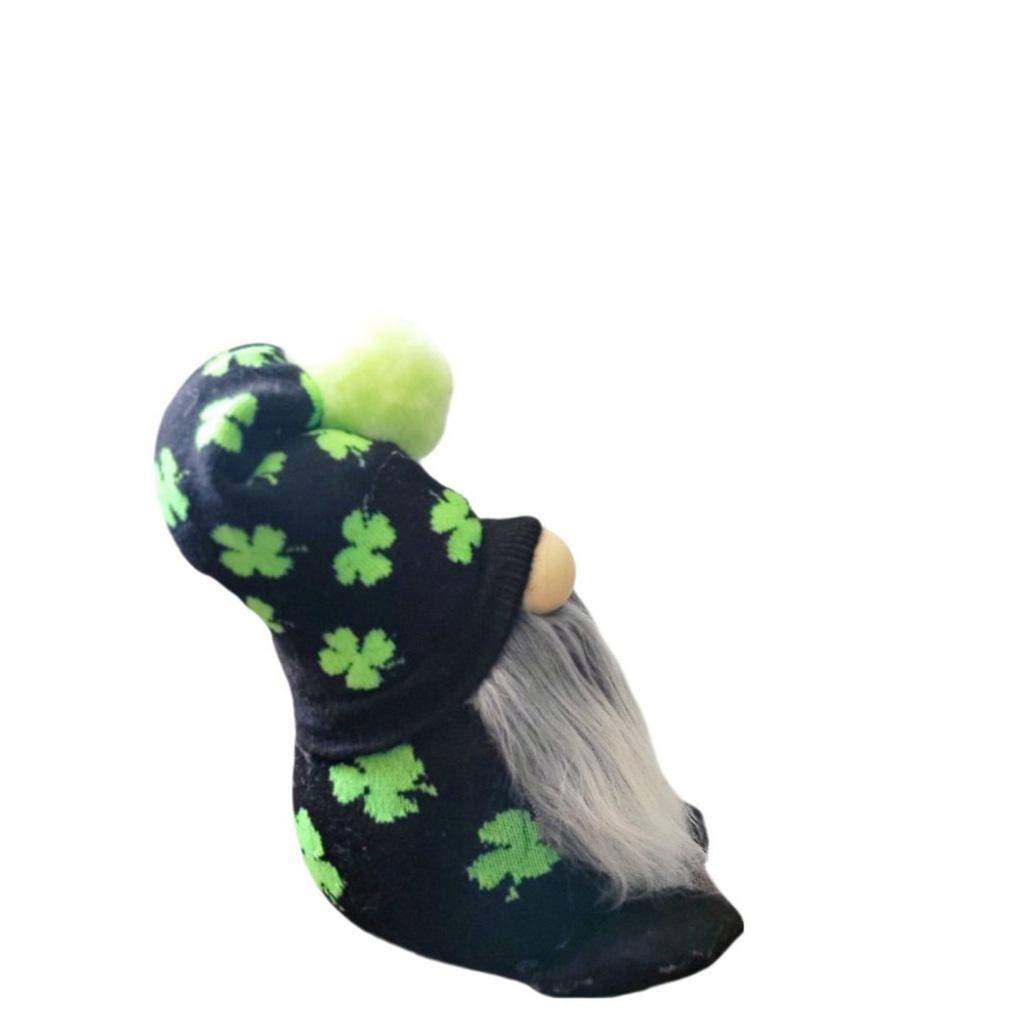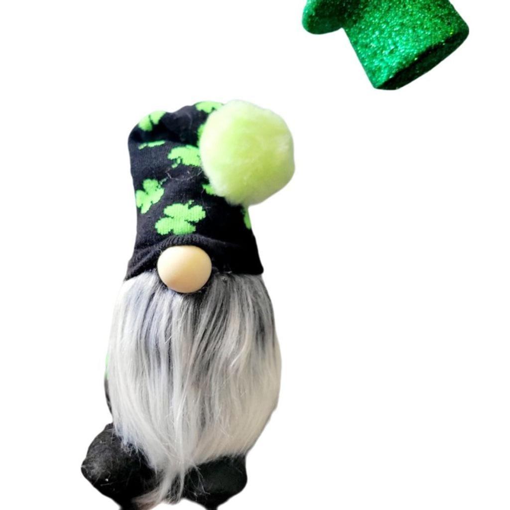 Hand crafted St Patrick's Day Leprechaun Gnome, with a black body with green shamrocks and matching hat, black boots, fluffy green pom pom adorning his hat, wooden nose, and flowing black and gray beard. He measures approximately 8" tall. Comes with a plastic black pot filled with shamrock coins. Perfect as a gift, St Patrick's Day decor, tiered tray, or Rae Dunn decor.