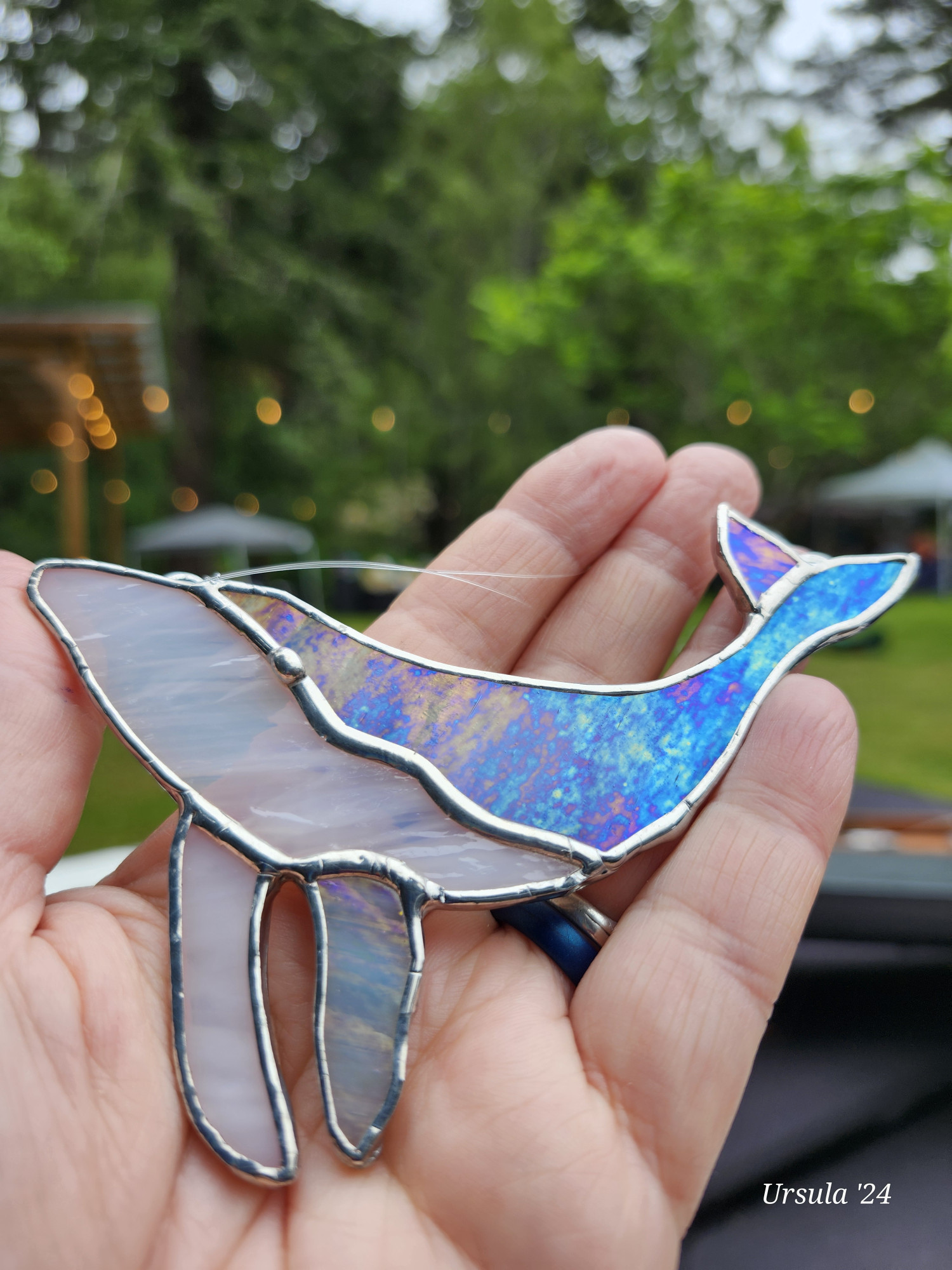 Stained Glass humpback wale. Hand made at time of order, glass varies in color and texture. If you have a specific color request please email me at time of order. If I do not hear from you It will be dealers choice. Mirrored pair will always face each other. If you order singles individually they will all face the same way.